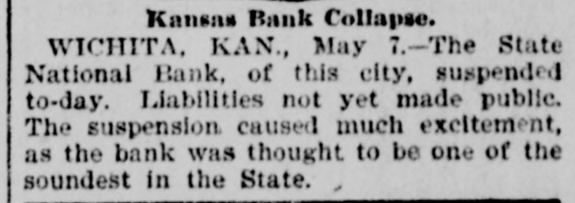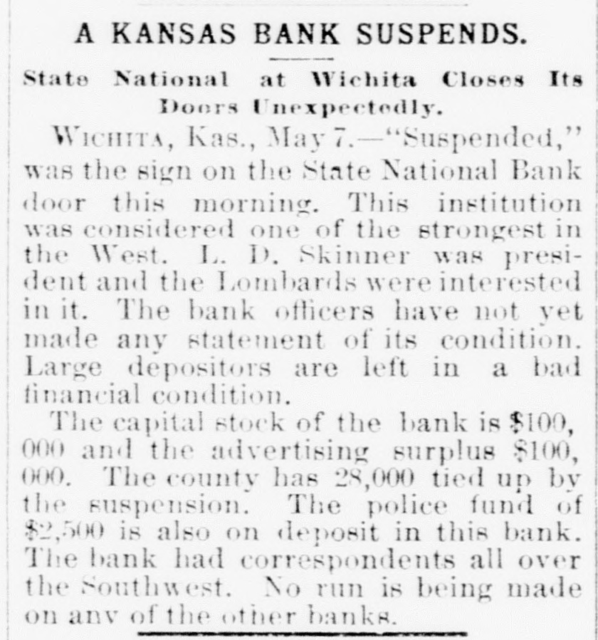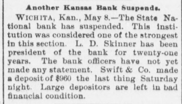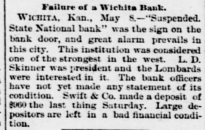Failure of a Wichita Bank. WICHITA, Kan., May S.-"Suspended. State National bank" was the sign on the bank door, and great alarm prevails in this city. This institution was considered one of the strongest in the west. L.D. Skinner was president and the Lombards were interested in it. The bank officers have not yet made any statement of its condition. Swift & Co. made a deposit of $960 the last thing Saturday. Large depositors are left in a bad financial condition.