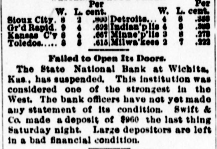 Per Per W. L. cent. W. L. cent. 8 4 Detroits. .800 8 2 Sioux City. Gr'd Rapid. 9 4 .692 Indian'plis 4 8 Kansas C'v 8 4 .667 Minne'p'lis 3 8 .278 8 .615 Milwa'kees 2 7 .222 Toledos. 8 Failed to Open Its Doors. The State National Bank at Wichita, Kas, has suspended. This institution was considered one of the strongest in the West. The bank officers have not yet made any statement of its condition. Swift & Co. made a deposit of $960 the last thing Saturday night. Large depositors are left in a bad financial condition.