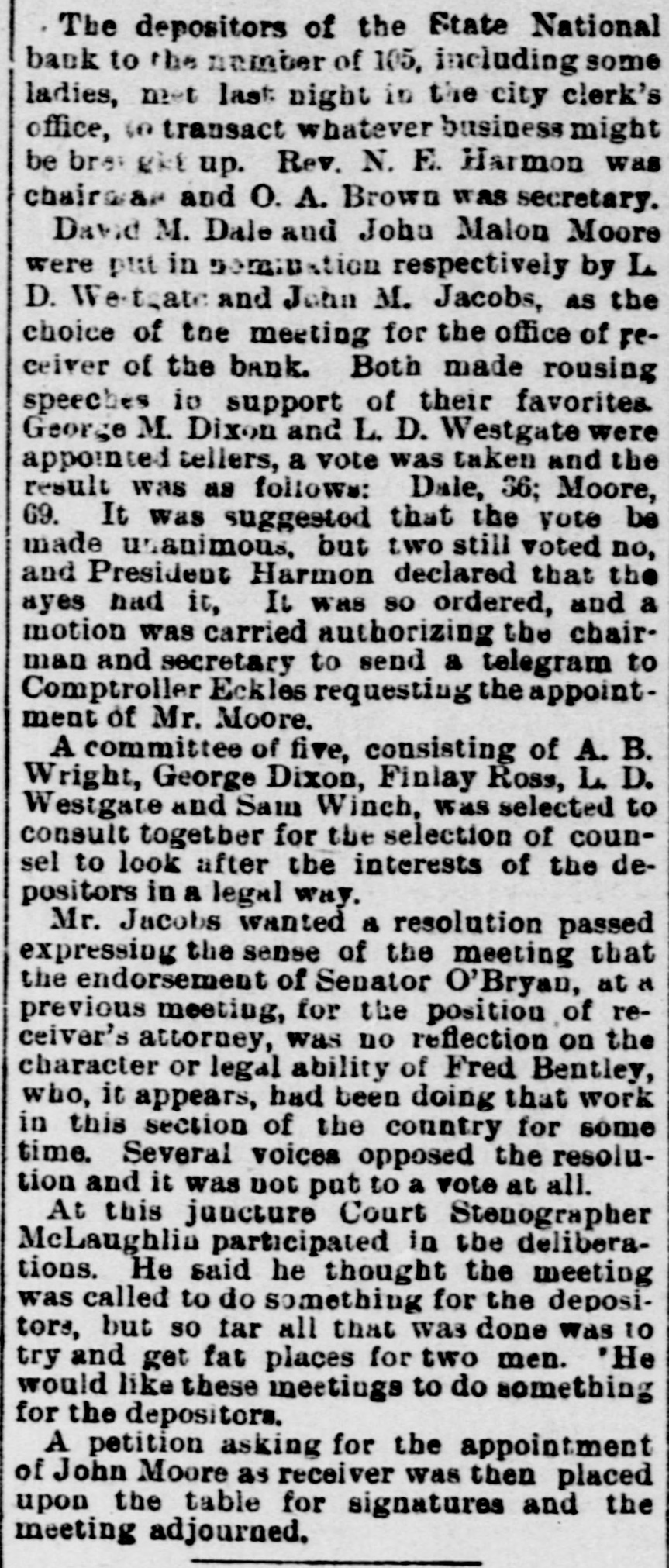 The depositors of the State National bank to the number of 105, including some ladies, met last night in the city clerk's office, to transact whatever business might be bre: gkt up. Rev. N. E. Harmon was chairman and O. A. Brown was secretary. David M. Dale and John Malon Moore were put in nomination respectively by L D. We-tgate and John M. Jacobs, AS the choice of the meeting for the office of receiver of the bank. Both made rousing speeches io support of their favorites. George M. Dixon and L. D. Westgate were appointed tellers, a vote was taken and the result was as follows: Dale, 36; Moore, 69. It was suggested that the vote be made unanimous, but two still voted no, and President Harmon declared that the ayes had it, It was so ordered, and a motion was carried authorizing the chairman and secretary to send a telegram to Comptroller Eckles requesting the appointment of Mr. Moore. A committee of five, consisting of A. B. Wright, George Dixon, Finlay Ross, L. D. Westgate and Sam Winch, was selected to consult togetber for the selection of counsel to look after the interests of the depositors in a legal way. Mr. Jacobs wanted a resolution passed expressing the sense of the meeting that the endorsement of Senator O'Bryan, at a previous meeting, for the position of receiver's attorney, was no reflection on the character or legal ability of Fred Bentley, who, it appears, had been doing that work in this section of the country for some time. Several voices opposed the resolution and it was not put to a vote at all. At this juncture Court Stenographer McLaughlia participated in the deliberations. He said he thought the meeting was called to do something for the depositors, but so tar all that was done was to try and get fat places for two men. 'He would like these meetings to do something for the depositors. A petition asking for the appointment of John Moore as receiver was then placed upon the table for signatures and the meeting adjourned.