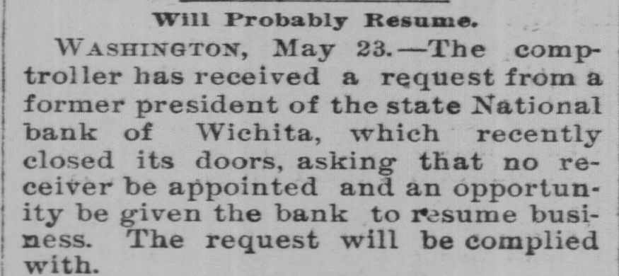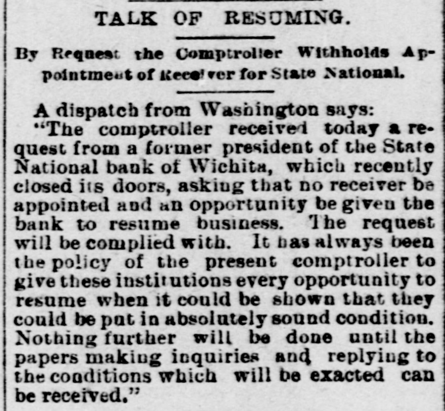 TALK OF RESUMING. By Request the Comptroller Withholds Appointment of Rece! ver for State National. A dispatch from Washington says: "The comptroller received today a request from a former president of the State National bank of Wichita, which recently closed its doors, asking that no receiver be appointed and an opportunity be given the bank to resume business. The request will be complied with. It has always been the policy of the present comptroller to give these institutions every opportunity to resume when it could be shown that they could be put in absolutely sound condition. Nothing further will be done until the papers making inquiries and replying to the conditions which will be exacted can be received."