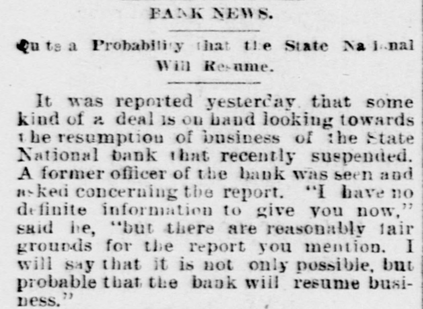 It was reported yesterday that some kind of a deal is on hand looking towards the resumption of business of the State National bank that recently suspended. A former officer of the bank was seen and asked concerning the report. "I have no definite information to give you now," said he, "but there are reasonably fair grounds for the report you mention. I will say that it is not only possible, but probable that the bank will resume business."