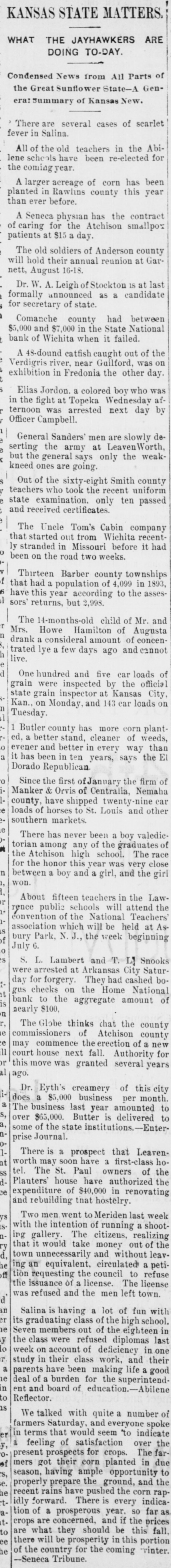 KANSAS STATE MATTERS. WHAT THE JAYHAWKERS ARE DOING TO-DAY. Condensed News from All Parts of the Great Sunflower State-A Generainummary of Kansas New. There are several cases of scarlet fever in Salina. All of the old teachers in the Abilene schools have been re-elected for the coming year. A larger acreage of corn has been planted in Rawlins county this year than ever before. A Seneca physian has the contract of caring for the Atchison smallpox patients at $15 day. The old soldiers of Anderson county will hold their annual reunion at Garnett, August 16-18. Dr. W. A. Leigh of Stockton is at last formally announced as a candidate for secretary of state. Comanche county had between $5,000 and $7,000 in the State National bank of Wichita when it failed. A 48-dound catfish caught out of the Verdigris river, near Guilford, was on exhibition in Fredonia the other day. Elias Jordon. a colored boy who was in the fight at Topeka Wednesday afternoon was arrested next day by Officer Campbell. General Sanders' men are slowly deserting the army at LeavenWorth, but the general says only the weakkneed ones are going. Out of the sixty-eight Smith county teachers who took the recent uniform state examination. only ten passed and received certificates. The Uncle Tom's Cabin company that started out from Wichita recently stranded in Missouri before it had been on the road two weeks. Thirteen Barber county townships that had a population of 4,099 in 1893, have this year according to the assessors' returns, but 2,998. The 14-months-old child of Mr. and Mrs. Howe Hamilton of Augusta drank a consideral amount of concentrated lye a few days ago and cannot live. One hundred and five car loads of grain were inspected by the official state grain inspector at Kansas City, Kan., on Monday, and 143 car loads on Tuesday. 1 Butler county has more corn plant ed. a better stand, cleaner of weeds, evener and better in every way than it has been in ten years, says the El Dorado Republican. Since the first of January the firm of Manker & Orvis of Centralia, Nemaha county, have shipped twenty-nine car loads of horses to St. Louis and other southern markets. There has never been a boy valedictorian among any of the graduates of the Atchison high school. The race for the honor this year was very close between a boy and a girl, and the girl won. About fifteen teachers in the Lawrence public schools will attend the convention of the National Teachers association which will be held at Asbury Park, N. J., the week beginning July 6. S. L. Lambert and T. L) Snooks were arrested at Arkansas City Saturday for forgery. They had cashed bogus checks on the Home National bank to the aggregate amount of nearly $100. The Globe thinks chat the county commissioners of Atchison county may commence the erection of a new 111 court house next fall. Authority for this move was granted several years ago. Dr. Eyth's creamery of this city idoes a $5,000 business per month. a The business last year amounted to over $65,000. Butter is delivered to some of the state institutions.-Enter prise Journal. There is a prospect that Leavenworth may soon have a first-class hotel. The St. Paul owners of the Planters' house have authorized the expenditure of $40,000 in renovating and rebuilding that hostelry. Two men went to Meriden last week with the intention of running a shooting gallery. The citizens, realizing that it would take money out of the town unnecessarily and without leaving an equivalent, circulated a petition requesting the council to refuse the issuance of a license. The license was refused and the men left town. d Salina is having a lot of fun with its graduating class of the high school. Seven members out of the eighteen in the class were refused diplomas last week on account of deficiency in one study in their class work, and their a parents have been making life a good deal of a burden for the superintend ent and board of education.-Abilene Reflector. We talked with quite a number oi farmers Saturday, and everyone spoke in terms that would seem "to indicate a feeling of satisfaction over the present prospects for crops. The farmers got their corn planted in due