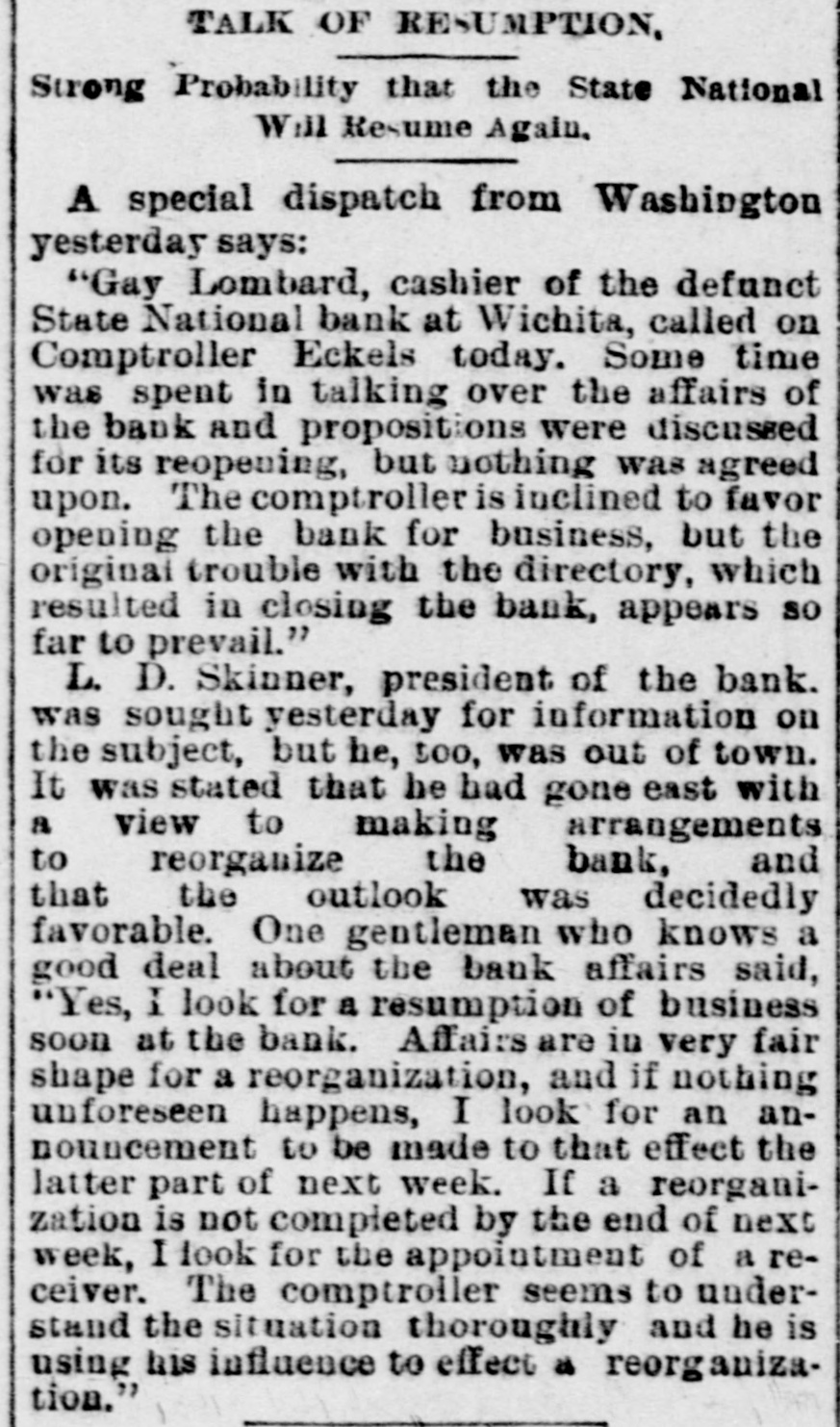 TALK OF RESUMPTION, Strong Probability that the State National Will Resume Again. A special dispatch from Washington yesterday says: "Gay Lombard, cashier of the defunct State National bank at Wichita, called on Comptroller Eckels today. Some time was spent in talking over the affairs of the bank and propositions were discussed for its reopening, but nothing was agreed upon. The comptroller is inclined to favor opening the bank for business, but the original trouble with the directory, which resulted in closing the bank, appears so far to prevail." L. D. Skinner, president of the bank. was sought yesterday for information on the subject, but he, too, was out of town. It was stated that he had gone east with a view to making arrangements to reorganize the bank, and that the outlook was decidedly favorable. One gentleman who knows a good deal about the bank affairs said, "Yes, I look for a resumption of business soon at the bank. Affairs are in very fair shape for a reorganization, and if nothing unforeseen happens, I look for an announcement to be made to that effect the latter part of next week. If a reorganization is not completed by the end of next week, I look for the appointment of a receiver. The comptroller seems to understand the situation thoroughly and he is using his influence to effect a reorganization."