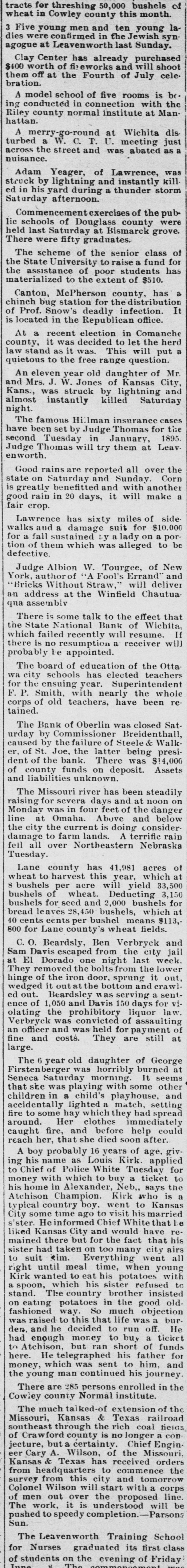 tracts for threshing 50,000 bushels of wheat in Cowley county this month. 3 Five young men and ten young ladies were confirmed in the Jewish syn agogue at Leavenworth last Sunday. Clay Center has already purchased $400 worth of i!eworks and will shoot them off at the Fourth of July cele. bration. A model school of five rooms is be. ing conducted in connection with the Riley county normal institute at Manhattan. A merry-go-round at Wichita disturbed a W. C. T. U. meeting just across the street and was abated as a nuisance. Adam Yeager, of Lawrence, was struck by lightning and instantly kill ed in his yard during a thunder storm Saturday afternoon. Commencement exercises of the public schools of Douglass county were held last Saturday at Bismarck grove. There were fifty graduates. The scheme of the senior class of the State University to raise a fund for the assistance of poor students has materialized to the extent of $510. Canton, McPherson county, has a chinch bug station for the distribution of Prof. Snow's deadly infection. It is located in the Republican office. At a recent election in Comanche county, it was decided to let the herd law stand as it was. This will put a quietous to the free range question. An eleven year old daughter of Mr. and Mrs. J. W. Jones of Kansas City, Kans., was struck by lightning and almost instantly killed Saturday night. The famous Hilman insurance cases have been set by Judge Thomas for the second Tuesday in January, 1895. Judge Thomas will try them at Leavenworth. Good rains are reported all over the state on Saturday and Sunday. Corn is greatly benefitted and with another good rain in 20 days, it will make a fair crop. Lawrence has sixty miles of sidewalks and a damage suit for $10.000 for a fall sustained Ly a lady on a portion of them which was alleged to be defective. Judge Albion W. Tourgee, of New York, authorof "A Fool's Errand' and "Bricks Without Straw," will deliver an address at the Winfield Chautuaqua assemblv There is some talk to the effect that the State National Bank of Wichita, which failed recently will resume. If there is no resumption a receiver will probably be appointed. The board of education of the Ottawa city schools has elected teachers for the ensuing year. Superintendent F. P. Smith, with nearly the whole corps of old teachers, have been retained. The Bank of Oberlin was closed Saturday by Commissioner Breidenthall, caused by the failure of Steele & Walker, of St. Joe, the latter being president of the bank. There was $14,000 of county funds on deposit. Assets and liabilities unknown. The Missouri river has been steadily raising for severa days and at noon on Monday was in four feet of the danger line at Omaha. Above and below the city the current is doing considerdamage to farm lands. A terrific rain fell all over Northeastern Nebraska Tuesday. Lane county has 41,981 acres of wheat to harvest this year, which at 8 bushels per acre will yield 33,500 bushels of wheat. Deducting 3,150 bushels for seed and 2,000 bushels for bread leaves 28,450 bushels, which at 40 cents cents per bushel means $113,800 for Lane county's wheat fields. C. O. Beardsly, Ben Verbryck and Sam Davis escaped from the city jail at El Dorado one night last week. They removed the bolts from the lower hinge of the iron door, sprung it out, wedged it the bottom and crawled out. Beardsley was serving a sentence of 1,050 and Davis 150 days for violating the prohibitory liquor law. Verbryck was convicted of assaulting an officer and was held for payment of fine and costs. They are still at large. The 6 year old daughter of George Firstenberger was horribly burned at Seneca Saturday morning. It seems that she was playing with some other children in a child's playhouse, and accidentally lighted a match, setting fire to some hay which they had spread around. Her clothes immediately caught fire, and before help could reach her, that she died soon after. A boy probably 16 years of age, giving his name as Louis Kirk. applied to Chief of Police White Tuesday for money with which to buy a ticket to his home in Alexander, Neb,, says the Atchison Champion. Kirk who is a typical country boy. went to Kansas City some time ago to visit his married s'ster. einformed Chief White that e liked Kansas City and would have remained there but for the fact that his sister had taken on too many city airs to suit Rim. Everything went all right until meal time, when young Kirk wanted to eat his potatoes with a spoon, which his sister refused to stand. The country brother insisted on eating potatoes in the good old fashioned way. So much objection was raised to this that life was a bur den, and he decided to run off. He had enough money to buy a ticket to Atchison, but ran short of funds here. He telegraphed his father for money, which was sent to him, and the young man continued his journey There are 285 persons enrolled in the Cowley county Normal institute.