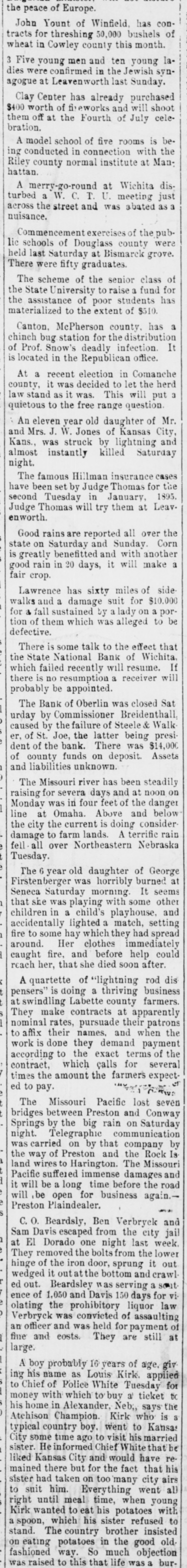 the peace of Europe. John Yount of Winfield, has contracts for threshing 50,000 bushels of wheat in Cowley county this month. 3 Five young men and ten young ladies were confirmed in the Jewish synagogue at Leavenworth last Sunday. Clay Center has already purchased $400 worth of fiveworks and will shoot them off at the Fourth of July celebration. A model school of five rooms is being conducted in connection with the Riley county normal institute at Manhattan. A merry-go-round at Wichita disturbed a W. C. T. U. meeting just across the street and was abated as a nuisance. Commencement exercises of the public schools of Douglass county were held last Saturday at Bismarck grove. There were fifty graduates. The scheme of the senior class of the State University to raise a fund for the assistance of poor students has materialized to the extent of $510. Canton. McPherson county, has a chinch bug station for the distribution of Prof. Snow's deadly infection. It is located in the Republican office. At a recent election in Comanche county, it was decided to let the herd law stand as it was. This will put a quietous to the free range question. An eleven year old daughter of Mr. and Mrs. J. W. Jones of Kansas City, Kans., was struck by lightning and almost instantly killed Saturday night. The famous Hillman insurance cases have been set by Judge Thomas for the second Tuesday in January, 1895. Judge Thomas will try them at Leavenworth. Good rains are reported all over the state on Saturday and Sunday. Corn is greatly benefitted and with another good rain in 20 days, it will make a fair crop. Lawrence has sixty miles of sidewalks and a damage suit for $10.000 for & fall sustained by a lady on a portion of them which was alleged to be defective. There is some talk to the effect that the State National Bank of Wichita, which failed recently will resume. If there is no resumption a receiver will probably be appointed. The Bank of Oberlin was closed Sat urday by Commissioner Breidenthall, caused by the failure of Steele & Walk er, of St. Joe, the latter being president of the bank. There was $14,000 of county funds on deposit. Assets and liabilities unknown. The Missouri river has been steadily raising for severa days and at noon on Monday was in four feet of the danger line at Omaha. Above and below the city the current is doing considerdamage to farm lands. A terrific rain fell all over Northeastern Nebraska Tuesday. The 6 year old daughter of George Firstenberger was horribly burned at Seneca Saturday morning. It seems that she was playing with some other children in a child's playhouse, and accidentally lighted a match, setting fire to some hay which they had spread around. Her clothes immediately caught fire, and before help could reach her, that she died soon after. A quartette of "lightning rod dis pensers" is doing a thriving business at swindling Labette county farmers. They make contracts at apparently nominal rates, pursuade their patrons to affix their names, and when the work is done they demand payment according to the exact terms of the contract, which calls for several times the amount the farmers expected to pay. The Missouri Pacific lost seven bridges between Preston and Conway Springs by the big rain on Saturday night. Telegraphic communication was carried on by that company by the way of Preston and the Rock Is land wires to Harington. The Missouri Pacific suffered immense damages and it will be a long time before the road will be open for business again.Preston Plaindealer. C. O. Beardsly, Ben Verbryck and Sam Davis escaped from the city jail at El Dorado one night last week. They removed the bolts from the lower hinge of the iron door, sprung it out wedged it out at the bottom and crawl ed out. Beardsley as serving a sout ence of 1,050 and Davis 150 days for violating the prohibitory liquor law Verbryck was convicted of assaulting an officer and was held for payment of fine and costs. They are still at large. A boy probably 16 years of alge, giv. ing his name as Louis Kirk. applied to Chief of Police White Tuesday for money with which to buy a ticket tic his home in Alexander, Neb;, says the Atchison Champion. Kirk who is a typical country boy, went to Kansas City some time ago to visit his married sister. He informed Chief White that be liked Kansas City and would have remained there but for the fact that his sister had taken on too many city airs to suit him. Everything went all right until meal time, when young Kirk wanted to eat his potatoes with a spoon, which his sister refused to stand. The country brother insisted on eating potatoes in the good old fashioned way. So much objection was raised to this that life hur.