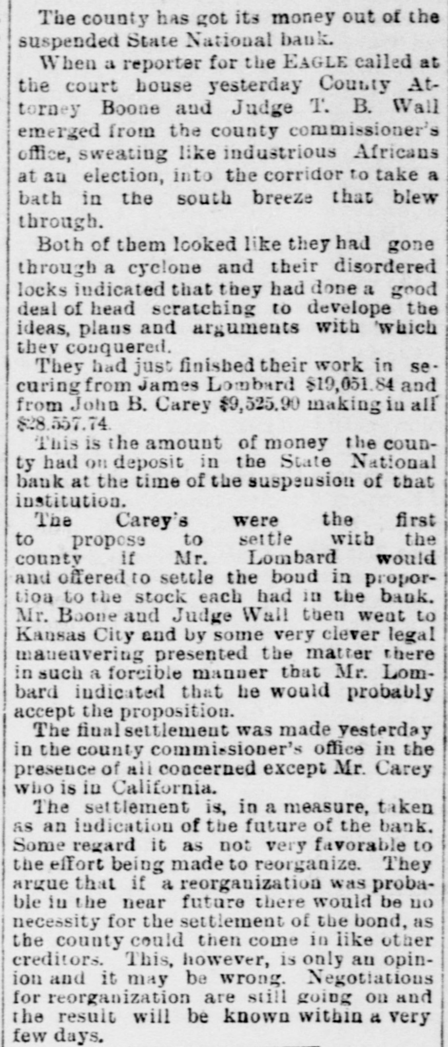 The Carey's were the first to propose to settle with the county if Mr. Lombard would and offered to settle the bond in proportion to the stock each had in the bank.