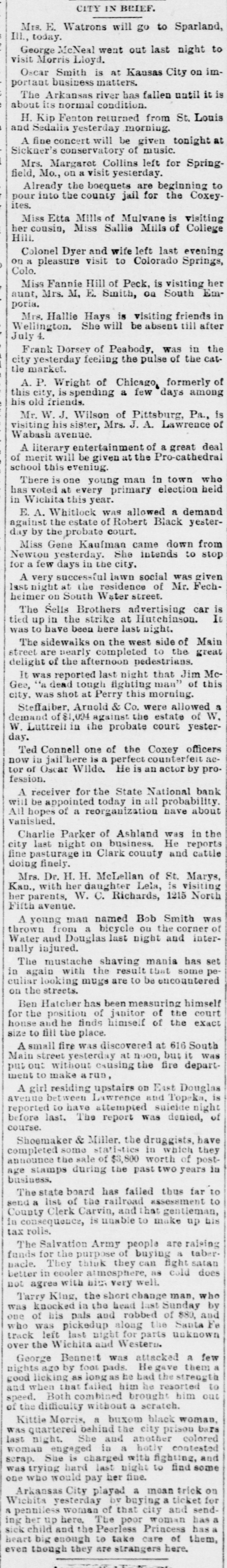 CITY IN BRIEF. Mrs. E. Watrons will go to Sparland, III., today. George McNeal went out last night to visit Morris Lloyd. Oscar Smith is at Kausas City on important business matters. The Arkansas river has fallen until it is about its normal condition. H. Kip Fenton returned from St. Louis and Sedalia yesterday morning. A fine concert will be given tonight at Sickner's conservatory of music. Mrs. Margaret Collins left for Springfield, Mo., on a visit yesterday. Already the boequets are beginning to pour into the county jail for the Coxeyites. Miss Etta Mills of Mulvane is visiting her cousin, Miss Sallie Mills of College Hill. Colonel Dyer and wife left last evening on a pleasure visit to Colorado Springs, Colo. Miss Fannie Hill of Peck, is visiting her aunt, Mrs. M, E. Smith, on South Emporia. Mrs. Hallie Hays is visiting friends in Wellington. She will be absent till after July 4. Frank Dorsey of Peabody, was in the city yesterday feeling the pulse of the cattle market. A. P. Wright of Chicago formerly of this city, is spending a few days among his old friends. Mr. W. J. Wilson of Pittsburg, Pa., is visiting his sister, Mrs. J. A. Lawrence of Wabash avenue. A literary entertainment of a great deal of merit will be given at the Pro-cathedral school this evening. There is one young man in town who has voted at every primary election held in Wichita this year. E. A. Whitlock WAS allowed a demand against the estate of Robert Black yesterday by the probate court. Miss Gene Kaufman came down from Newton yesterday. She intends to stop for a few days in the city, A very successful lawn social was given last night at the residence of Mr. Fechheimer on South Water street. The Sells Brothers advertising car is tied up in the strike at Hutchinson. It was to have been here last night. The sidewalks on the west side of Main street are nearly completed to the great delight of the afternoon pedestrians. It was reported last night that Jim McGee, "a dead tough fighting man" of this city, was shot at Perry this morning. Steffaiber, Arnold & Co. were allowed a demand of $1,094 against the estate of W. W. Luttrell in the probate court yesterday. Ted Connell one of the Coxey officers now in jail here is a perfect counterfeit actor of Oscar Wilde. He is an actor by profession. A receiver for the State National bank will be appointed today in all probability. All hopes of a reorganization have about vanished. Charlie Parker of Ashland was in the city last night on business. He reports fine pasturage in Clark county and cattle doing finely. Mrs. Dr. H. H. McLellan of St. Marys, Kan., with her daughter Lela, is visiting her parents, W. C. Richards, 1215 North Fifth avenue. A young man named Bob Smith was thrown from a bicycle ou the corner of Water and Douglas last night and internally injured. The mustache shaving mania has set in again with the result that some peculiar looking mugs are to be encountered on the streets. Ben Hatcher has been measuring himself for the position of janitor of the court house and he finds himself of the exact size to fill the place. A small fire was discovered at 616 South Main street yesterday at noon, but it was put out without causing the fire department to make arun, A girl residing upstairs OD East Douglas avenue between Lawrence and Topeka, is reported to have attempted suicide night before last. The report was denied, of course. Shoemaker & Miller. the druggists, have completed some statistics in which they announce the sale of $3,800 worth of postage stamps during the past two years in business. The state board has failed thus far to send a list of the railroad assessment to County Clerk Carvin, and that gentleman, in consequence, is unable to make up his tax rolls. The Salvation Army people are raising funds for the purpose of buying a taber. nacle. They think they can fight satan better in cooler atmosphere, as cold does not agree with him very well. Tarry King, the short change man, who was knocked in the head last Sunday by one of his pals and robbed of $80, and who was pickedup along the Santa Fe track left last night for parts unknown over the Wichita and Western. George Benneit was attacked a few nights ago by foot pads. He gave them a good licking as longas he bad the strength and when that failed him he resorted to speed. Both combined brought him out of the difficulty without a scratch. Kittle Morris, a buxom black woman, was quartered behind the city prison bars last night. She and another colored woman engaged in a hotly contested scrap. She is charged with fighting, and was trying hard last night to find some one who would pay her fine. Arkansas City played a mean trick on Wichita yesterday bv buying a ticket for & penniless woman of that city and sending her up here. The poor woman has a sick child and the Peerless Princess has a heart big enough to take care of them, even though they are strangers here.