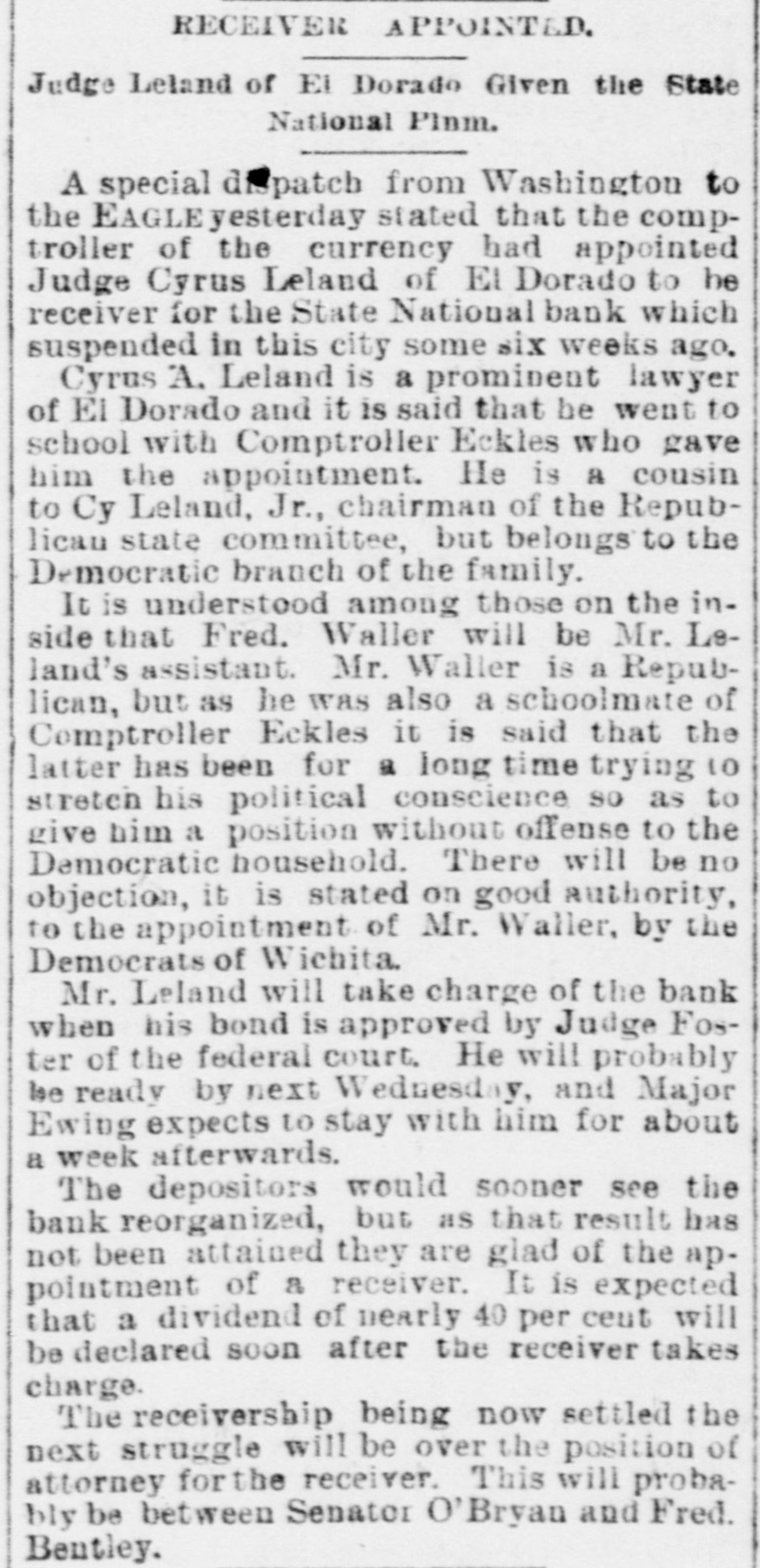 RECEIVER APPOINTED. Judge Leland of El Dorado Given the State National Plnm. A special dispatch from Washington to the EAGLE yesterday stated that the comptroller of the currency had appointed Judge Cyrus Leland of El Dorado to be receiver for the State National bank which suspended in this city some six weeks ago, Cyrus A. Leland is a prominent lawyer of El Dorado and it is said that be went to school with Comptroller Eckles who gave him the appointment. He is a cousin to Cy Leland, Jr., chairman of the Republican state committee, but belongs to the Democratic branch of the family. It is understood among those on the inside that Fred. Waller will be Mr. Leland's assistant. Mr. Waller is a Republican, but as he was also a schoolmate of Comptroller Eckles it is said that the latter has been for a long time trying 10 stretch his political conscience SO as to give him a position without offense to the Democratic household. There will be no objection, it is stated on good authority, to the appointment of Mr. Waller, by the Democrats of Wichita. Mr. Leland will take charge of the bank when his bond is approved by Judge Foster of the federal court. He will probably lse ready by next Wednesday, and Major Ewing expects to stay with him for about a week afterwards. The depositors would sooner see the bank reorganized, but as that result has not been attained they are glad of the appointment of a receiver. It is expected that a dividend of nearly 40 per cent will be declared soon after the receiver takes charge. The receivership being now settled the next struggle will be over the position of attorney forthe receiver. This will probably be between Senator Bryan and Fred. Bentley.