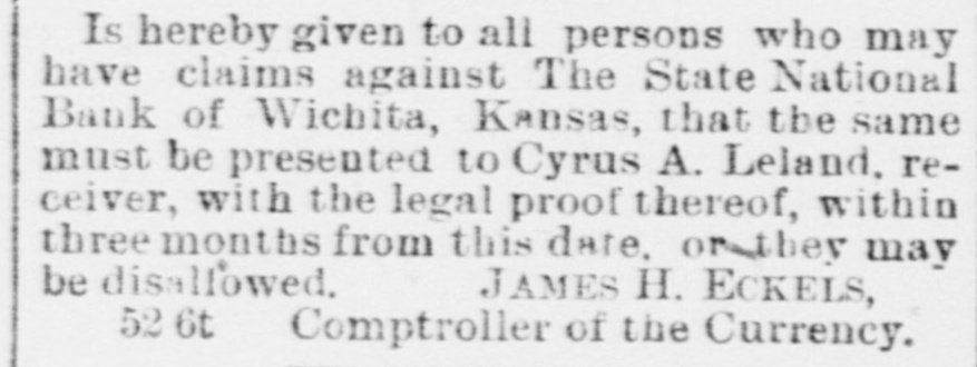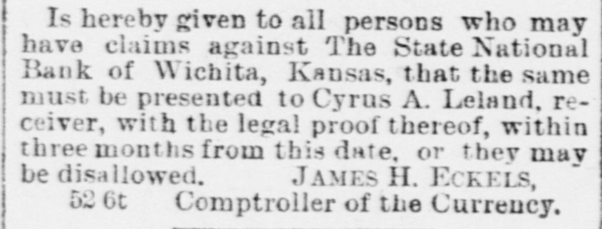 Is hereby given to all persons who may have claims against The State National Bank of Wichita, Kansas, that the same must be presented to Cyrus A. Leland, receiver, with the legal proof thereof, within three months from this date, or they may be disallowed. JAMES H. ECKELS, 52 6t Comptroller of the Currency.