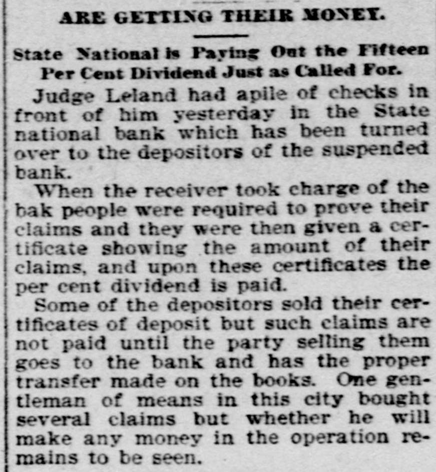 ARE GETTING THEIR MONEY. State National is Paying Out the Fifteen Per Cent Dividend Just as Called For. Judge Leland had apile of checks in front of him yesterday in the State national bank which has been turned over to the depositors of the suspended bank. When the receiver took charge of the bak people were required to prove their claims and they were then given a certificate showing the amount of their claims, and upon these certificates the per cent dividend is paid. Some of the depositors sold their certificates of deposit but such claims are not paid until the party selling them goes to the bank and has the proper transfer made on the books. One gentleman of means in this city bought several claims but whether he will make any money in the operation remains to be seen.