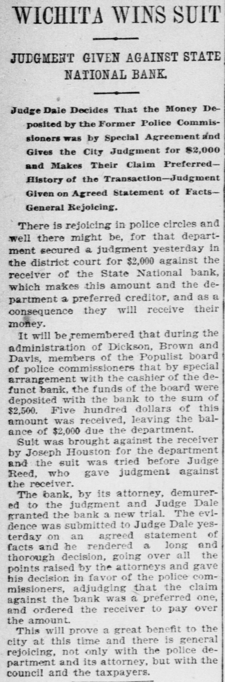 It will be remembered that during the administration of Dickson, Brown and Davis, members of the Populist board of police commissioners that by special arrangement with the cashier of the defunct bank, the funds of the board were deposited with the bank to the sum of $2,500. Five hundred dollars of this amount was received, leaving the balance of $2,000 due the department.