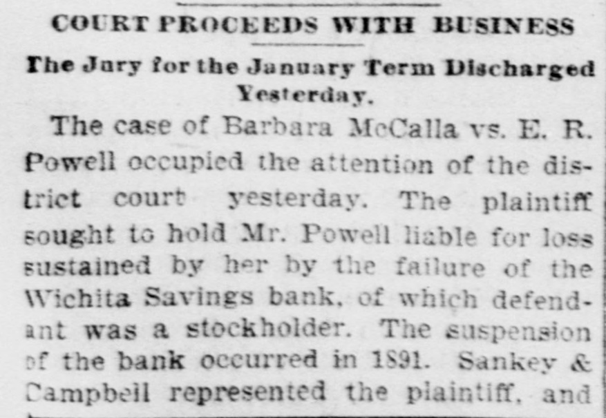 COURT PROCEEDS WITH BUSINESS The Jury for the January Term Discharged Yesterday. The case of Barbara McCalla vs. E. R. Powell occupied the attention of the distriet court yesterday. The plaintiff sought to hold Mr. Powell liable for loss sustained by her by the failure of the Wichita Savings bank, of which defendant was a stockholder. The suspension of the bank occurred in 1891. Sankey & Campbell represented the plaintiff, and