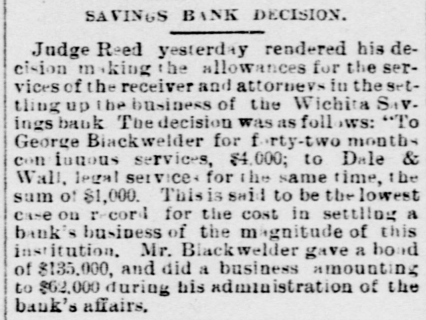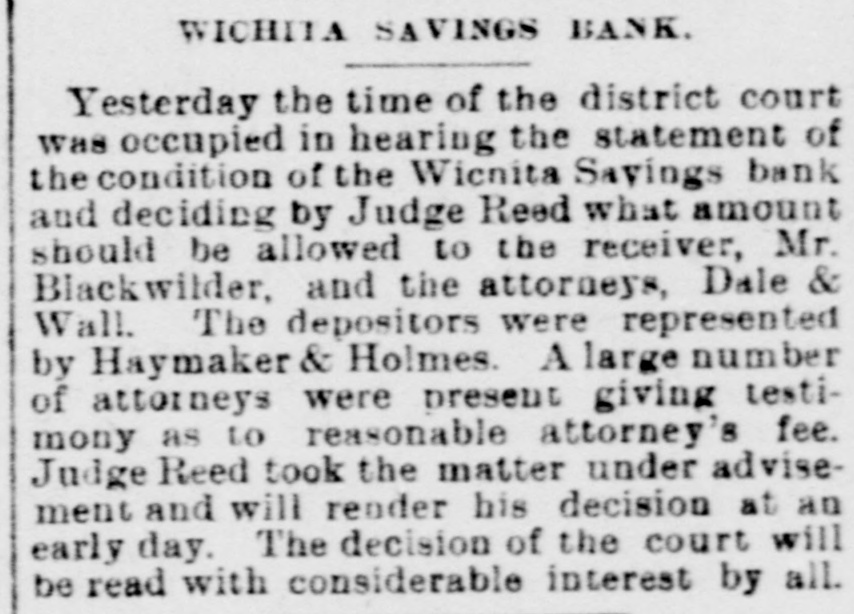WICHITA SAVINGS BANK. Yesterday the time of the district court was occupied in hearing the statement of the condition of the Wicnita Savings bank and deciding by Judge Reed what amount should be allowed to the receiver, Mr. Blackwilder, and the attorneys, Dale & Wall. The depositors were represented by Haymaker & Holmes. A large number of attorneys were present giving testimony as to reasonable attorney's fee. Judge Reed took the matter under advisement and will render his decision at an early day. The decision of the court will be read with considerable interest by all.