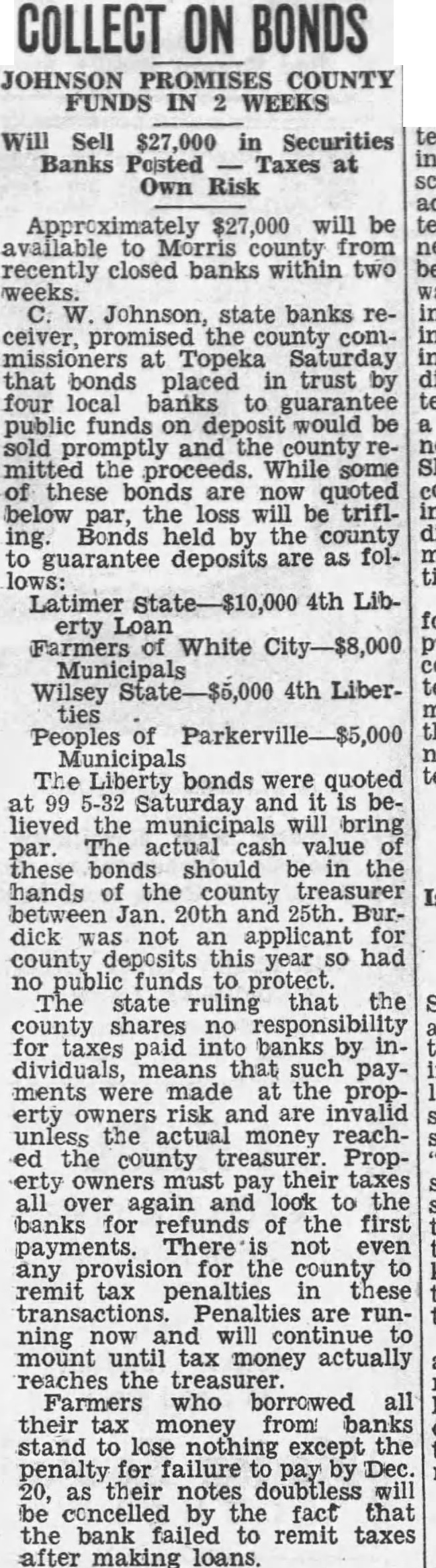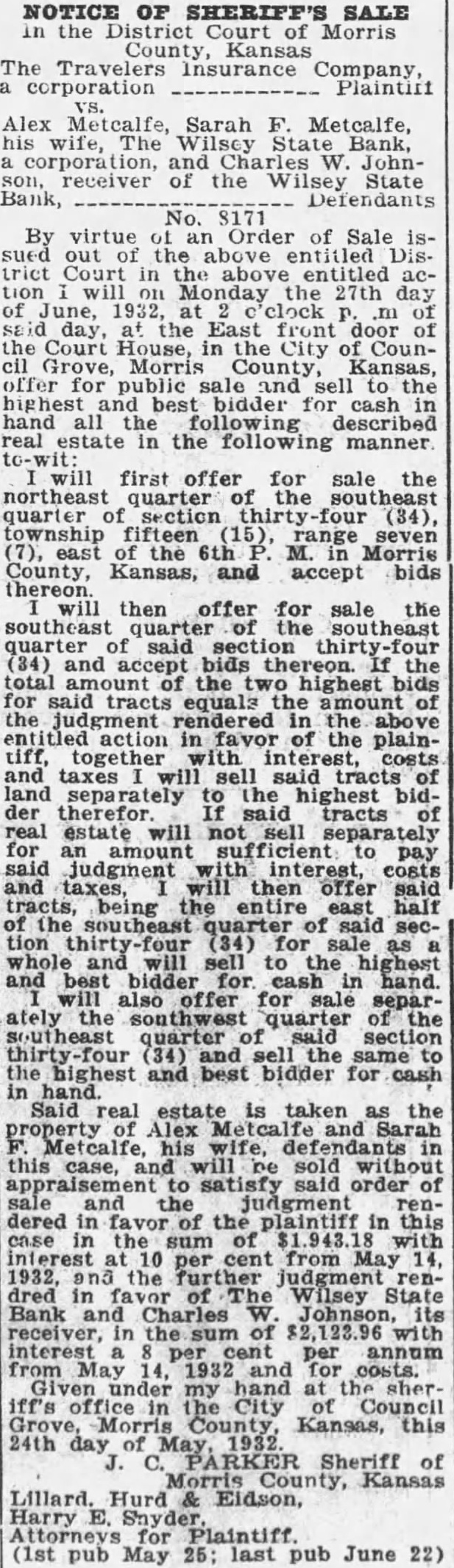 NOTICE OF SHERIFF'S SALE in the District Court of Morris County Kansas The Travelers Insurance Company, corporation Alex Metcalfe, Sarah F. Metcalfe, his The Wilsey Bank, corporation, and W Johnson, receiver of the Wilsey State Bank, Defendants No. 8171 By virtue an Order of Sale isout of the above entitled District Court in the above entitled action will on Monday the 27th day of June, 1932, at m day, at the East front door the Court House, in the City of Council Grove, Morris County Kansas, offer for public sale and sell to the highest and best bidder for cash in hand all the following described real estate in the following manner will first offer for sale the northeast quarter of the southeast quarter of section thirty (34), township fifteen range seven (7), east of the 6th M. Morris County, Kansas, and accept bids thereon. will then offer for sale the southeast southeast quarter said section (34) and accept bids thereon. If the total amount of the two highest bids for said tracts equals the amount of the judgment rendered in the above entitled action in favor of the plaintiff together interest, costs and taxes will sell said tracts of land separately to the highest bidder therefor said tracts of real estate will not sell separately for amount sufficient to pay said judgment interest, costs taxes, will then offer said tracts, being the entire east half of the southeast quarter of said section (34) for as whole and will sell to the highest and best bidder for cash in hand. will also offer for sale separ. ately the southwest quarter southeast quarter said section thirty four (34) and the same to the in hand. highest and best bidder for cash Said real estate is taken as the property Alex and Sarah Metcalfe, his wife, defendants in this case, and will be sold without appraisement to satisfy said order sale and the judgment rendered in favor of the plaintiff in this case in the sum of $1.943.18 with interest 10 per cent from May 1932, and the further judgment rendred in The Wilsey State Bank and Charles Johnson, receiver in the of $2,123.96 interest a per cent per annum from May 14, 1932 and for costs. Given under my hand at the sheriff's office in the City of Council Grove, 24th of County, 1932. Kansas, this day May, J. PARKER Sheriff of Morris County, Kansas Lillard. Hurd & Eldson, Harry E. Attorneys for Plaintiff (1st pub May 25; last pub June 22)