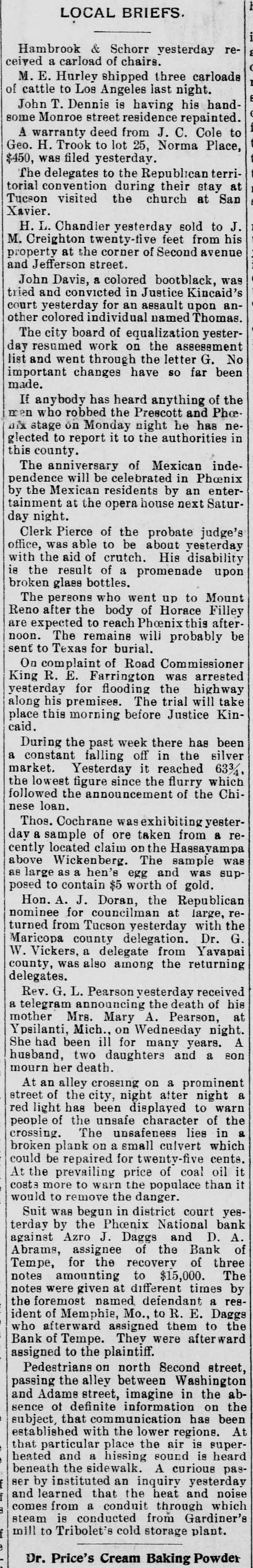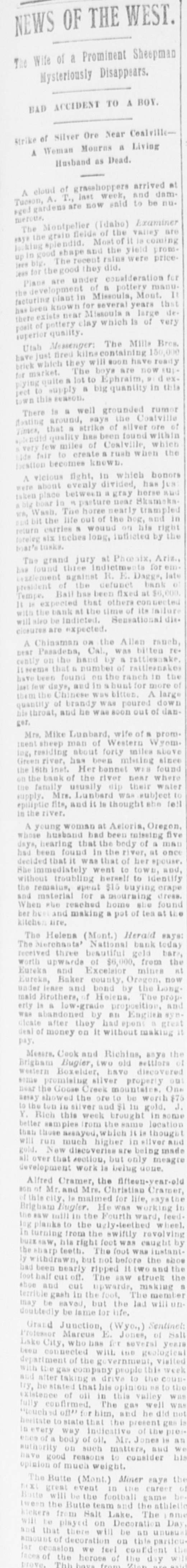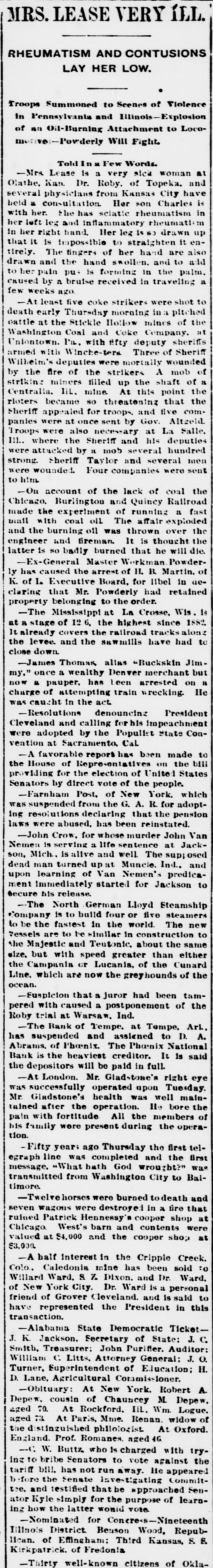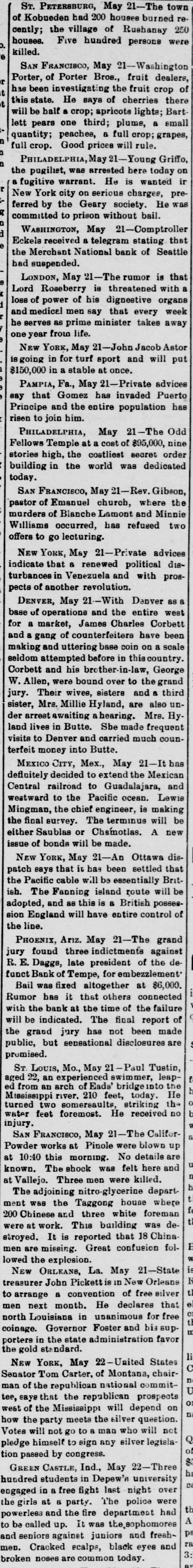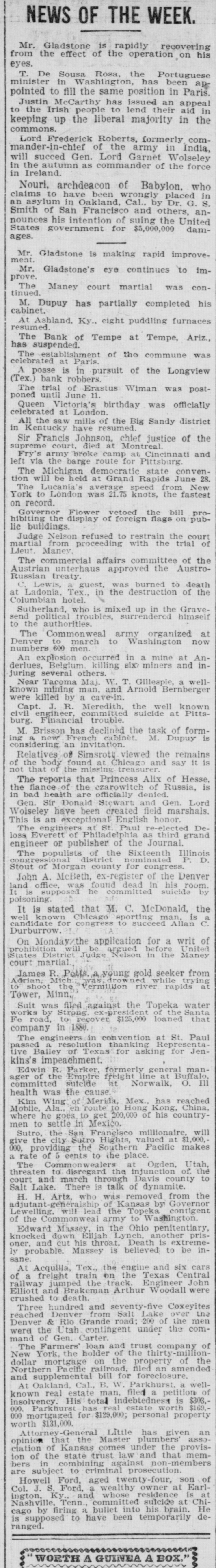 LOOKING BACKWARD. Leading Events of a Memorable Twelve Months. THE YEAR 1894 PASSED IN REVIEW. Failures, Casualties, Crimes, Foreign and Industrial Happenings, Meteorology, Political, Social and Sporting Events Chronologically Recorded. BUSINESS FAILURES. BANKS GENERALLY. OTHERS FOR $500,000 AND OVER. Jan. 3-Southern Land and Improvement Co., Frankfort. Ky.; $500,000, Jan. 9-Citizens' bank at Ogden, Utah Bank of Port Washington, Wis. Jan. 10-W. T. Beek & Co., San Francisco commission merchants; $750,000. Jan. 14-Mendville (Pa.) savings bank Jan. 16-Merchants' bank, Ellis. Kan. Jan. 16-Third national bank, Detroit Bank of Zumbrota, Minn. Jan. 324 Westview savings bank, at Louisvilie, Ky. Jan. 24-First national bank, Fort Payne; Ala. Feb. 9-Signa Iron Co., of Philadelphia; $100,000 Feb. 14-American national bank at Springfield, Mo Burlington (Ia.) Fire & Tornado Insurance Co. Mar. 2-State bank at Brookville, Kan. Mar. 7-Bank of Harrison, Neb. Mar. 13-Bank of Excelsior Springs, Mo. Mar.28--Peoplelssavings bank of Duluth, and Merchants' bank of West Duluth. Apr. 6--J. B. Watkins Mortgage Co. of Lawrence, Kan: $5,550,000, Apr. 10-Aspen (Col.) national bank. Apr. 18-W. Thomas & Son. whisky dealers and distillers at Louisville, Ky.; $500,000. Apr. 19-West Superior Iron & Steel company of Milwaukee: $2,500,000. Apr. 24-Merchants bank of Enid, O. T. Apr. 27-Henry Newman & Co., importers of clothing supplies in New York: $1,500,000. Apr. 30-Scandinavian and Finland Emigrant Co. of New York; $4,000,000. May 4-First national bank of Sedalia, Mo. May 7-State national bank at Wichita, Kan. May 8-A. N. Schuster & Co., clothing dealers at St. Joseph, Mo.: $500,000. May 16-National bank of Pendleton, Ore. May 18-The order of Tonti to ha nds of receiver in Philadelphia. May 20-Traders' bank of Tacoma. May 24-Bank of Tempe at Phoenix, A. T. May 31-Bank at Enterprise, Kan. June 4-Steele & Walker, wholesale grocers at St. Joseph, Mo.: $700,000. June -Farmers' and Merchants' bank at South End. O. T. June German national bank at Denver, Col: $853,000. June 8-Union Warehouse Co. of New York; $1,000,000. June 10-American Investment Co. at Emmettsburg, In.: $800,000. June 18-Goodwin & Swift, of New York, electric railway builders and promoters; $750,000. June 21-Black Hills national bank of Rapid City, S. D. July 26-First national bank of Grant, Neb. Aug. 1-Baker City (Ore.) national bank. Aug. 7 Citizens' savings bank at Portsmouth, O. Aug. 10-Second national bank, Altoona. Pa. Aug, 18-Wichita (Kan.) national bank. Aug. 17-Commercial & Savings bankof Ludington, Mich. Sep. 6-Middleton (Pa.) bank. Sep. 7-Mutual Benefit Life associatio n of America ,headquarters at New York: $10,000,000 Oklahoma county bank at South Enid, O.T. Sep. 10-Citizens' bank of Plattsmouth, Neb. Sep. 21-Commercial bank at Weeping Water, Neb. Oct. 1-First national bank of Fayetteville, N.Y. Oct. 5-Coffin & Stanton, stock. brokers in New York: $3,600,000. Oct. 10-American Debenture Co., of Chicago; $1,500,000. Oct. 11-First national bank of Kearney, Neb. Oct. 12-Buffalo county national bank at Kearney, Neb. Oct. 16-Merced bank, at Merced, Cal. Oct. 23-George M. Irvin & Co., of Pittsburgh, Pai $1,000,000. Oct. 25-J. J Reithman and J. J. Reithman & Co. wholesale druggists in Denver; $500,000. Nov. 8-San Bernardino (Cal.) First national bank. Nov. 12-First national bank of Johnson City, Tenn. Nov. 10-Portland (Ore.) savings bank; $1,430,000. Nov. 23-Brown national bank at Spokane, Wash. Nov. 27-Kendall Banking company at Howard, S.D. Security National bank of Grand Island, Neb. Nov. 28-Bank of Canova, S. D. Dec. 4-North Platte (Neb.) national bank. Tacoma (Wash.) national bank. Dec. S-Farmers' Insurance Co., of Seattle, Wash. Dec. 11-Commercial bank, at St. Joseph, Mo.