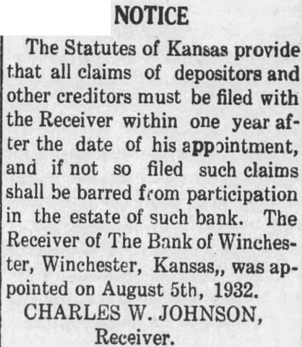 Mr. Gruner Recuperating H. A. Gruner, assistant receiver of The Bank of Winchcester, is recuperating by taking a vacation. During his absence the bank will be closed during the day, but anyone having business to transact with the institution can get in touch with Edward Trimble by calling the county clerk's office in Oskaloosa. Edward will arrange to keep the bank open each evening from 7 till 9 o'clock, so persons may have an opportunity to transact their business with the bank. At this time Mr. Gruner is feeling some better and the Star trusts he may soon be himself again.