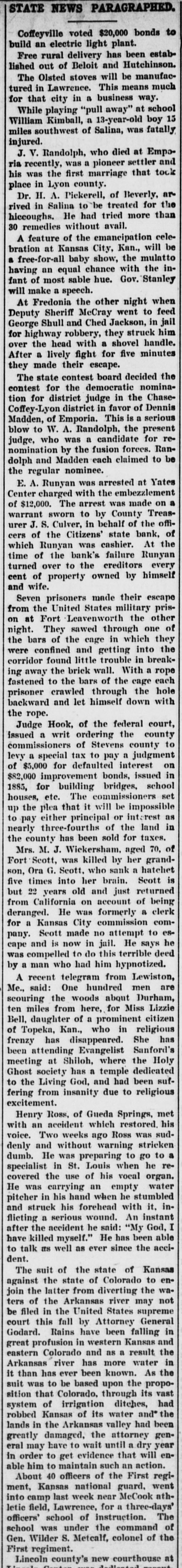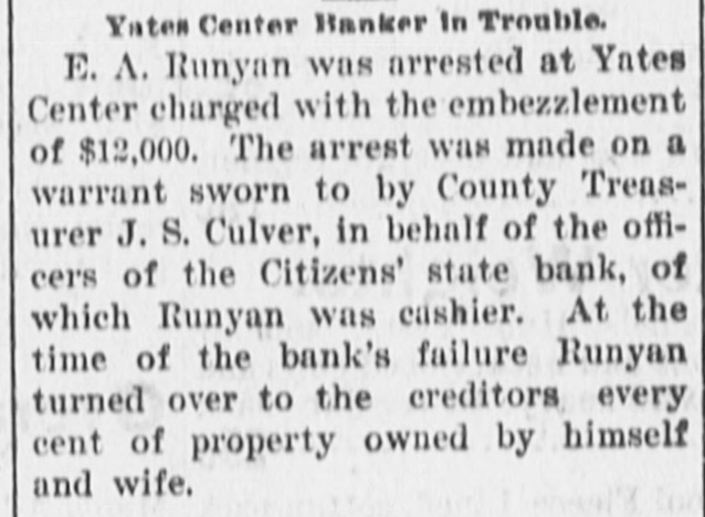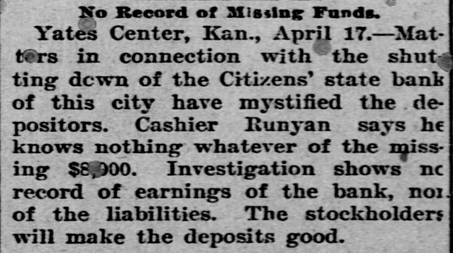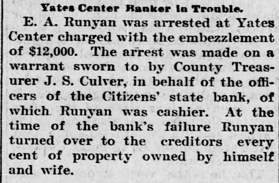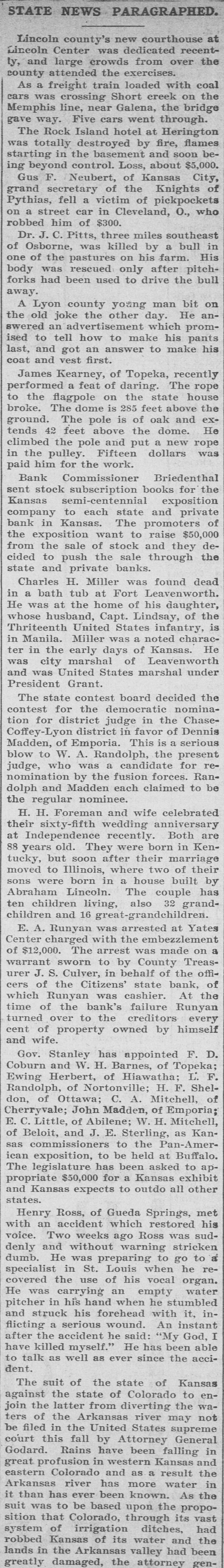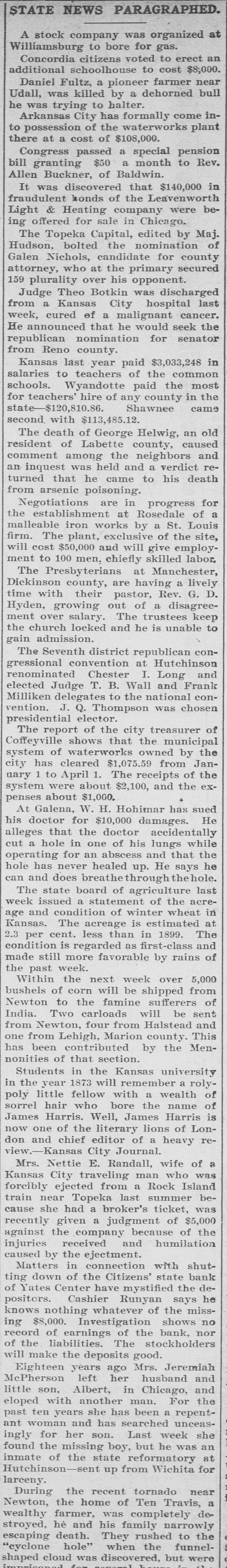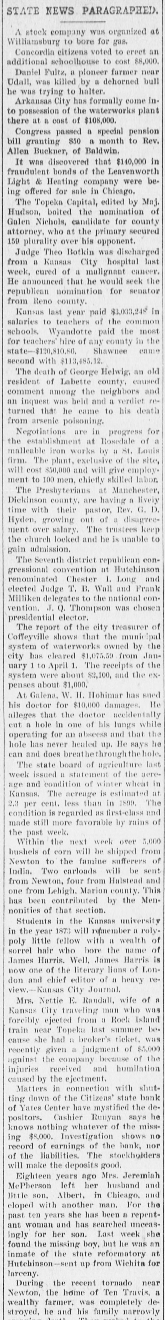 BUSINESS FAILURES. Jan. 3-Wabasha, Minn., People's bank. 6-Rahway, N. J., Union county bank New York, Hulbert H. Warner, patent medicine manf.; $2,319,027. 9-Plankinton, S. D., State bank. 17-Chicago, Francis P. Owings, real estate: $5,364,977. Feb. 7-New Bedford, Mass., Henry E. Holcomb, manf.; $1,351,438 Boston, Miner, Beal & Co., clothing firm, $450,000. 26-United States milling combine (flour trust); $15,000,000. Mar. 3-Port Jervis (N. Y.) Nat. bank resumes; had suspended payment in December. 6-J. F. Seiberling, formerly manufacturer at Akron, O., files bankruptcy petition; $800,000, assets, $30. 19-John Kehoe, builder of New York, files bankruptcy petition; $1,520,085; no assets. 22-D. Appleton & Co., New York, publishers; $3,000,000. 26-Rutland, Vt., Merchants' Nat. bank Keene, N. H., Five Cent savings bank for $1,449,058; $718,873. and Guarantee savings bank for Apr. 000. 3-Cambridge (Neb.) State bank; $40,10-Columbus, $140,000. O., Reinhard & Co.'s bank; 12-Yates Center, Kan., Citizens' state bank. 27-Adolph Landauer, dry goods dealer of Milwaukee; $391,945.31. May 11-Frank L. Fuller's private banks at Rockford and Cedar Springs, Mich. 21-Pentwater, Mich., Neilson & Co.'s bank. 26-Price, McCormick & Co., of New York, cotton brokers and shippers; $13,000,000. 28-Seymour, Johnson & Co., stock and cotton brokers of New York; $500,000. Jun. 5-W. C. Shields' bank at Mulberry Grove, Ill. 15-McNair & Alexander, cattlemen at Ashland, Kan.; $542,000. ug. 13-Henry J. "Neill, the "barley king," files petition in bankruptcy; $500,000.... Kingfisher (Col.) bank: $61,000. 17-Somerset (Ky.) Nat. bank. Sep. 6-Lamont (III.) state bank; $12,000. 7-Fifth Avenue Savings & Loan Ass'n., of McKeesport, Pa.; $500,000. 18-Hatch 000,000. & Foote, New York brokers; $2,19-South Mass. Danvers Nat. bank, at Peabody, Nov. 17-German Nat. bank, at Newport, Ky. Dec. 12-Bank at Brillion, Wis. 13-Order of Chosen Friends, large fraternal insurance association. 21-American nat. bank of Baltimore, Md. 25-Isaac Robinson, at Baltimore, Md., manufacturer; $800,000.
