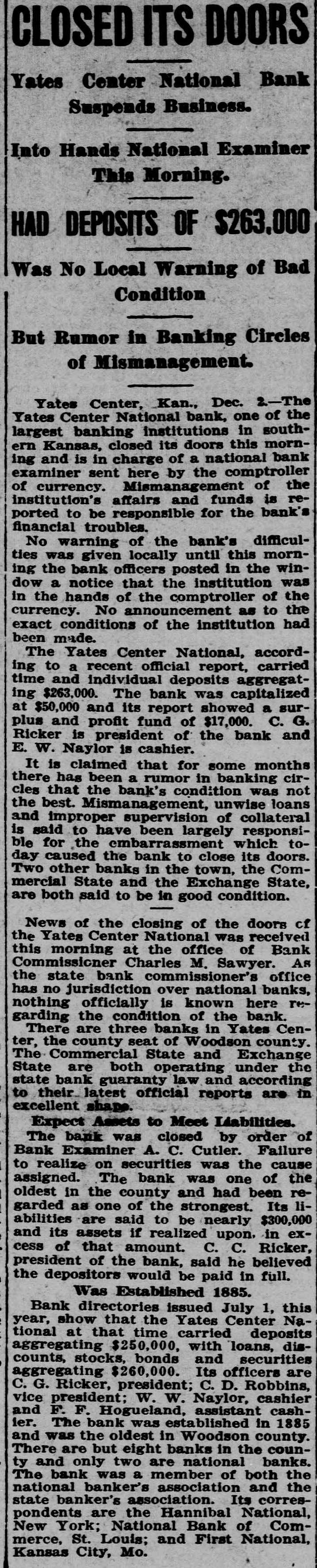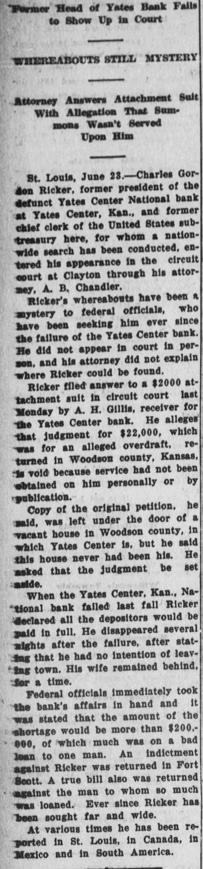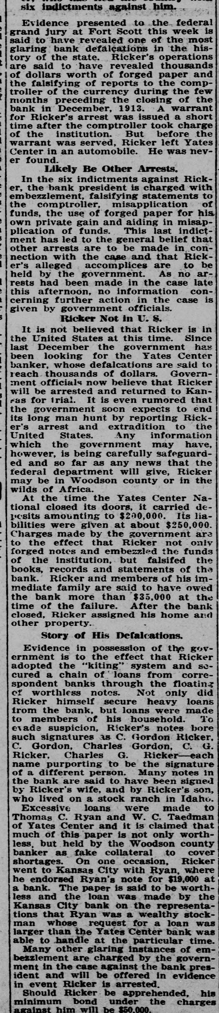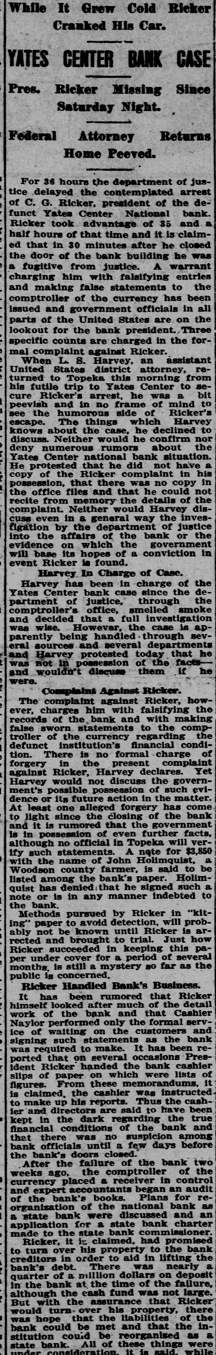 IS PASSED RICKER CASE Senate Approves Conference Echoes of Yates Center Bank Case Are Sad. Report on Currency Measure. It Now Goes to the President Widow Who Lost Her Allfor Signature. Ricker's Wife Destitute. FINAL VOTE STOOD 43 TO BELONGED TO CHURCH Three Republicans and One Had a Good Record Up to Bull Moose Join Majority. This Time. It Was Passed by the House His Son Is Loyal and Still Be298 to 60. lieves Father Will Pay. Washington, Dec. 3.-The conference New stories of the affairs of the report on the administration currency Yates Center National bank indicate bill was approved by the senate today that the condition of the institution is by a vote of 43 to 25. As the house even worse than at first reported and already had approved it there remain no one pretends to know the extent of ed only the signature of the vice presPresident Ricker's shortages and deident and the speaker to complete the falcations, although the total has been to measure for the president's signature. conservatively placed at $175,000 Three Republicans and Senator Poin$200,000. dexter, Progressive, joined the DemoAs the gossip of the affairs of the crats, voting for the bill in its final form. bank is told and retoid on the streets The Republicans were Senators Jones, of Yates Center, some new sensation is Norris and Weeks. The passage of the daily added to make conditions even report was greeted with little demonstration. worse than first reports indicated. R. Bristow Attacks the Bill. H. Trueblood, a director and stockWhen the senate debate began unholder in the bank, admits that the in- 25 stitution will not pay more than der the agreement to vote by 2:30 this afternoon, Senator Bristow, one of the per cent to the depositors. Other perRepublicans on the banking commitsons in touch with the affairs of the tee who had been denied admittance bank are inclined to believe that Trueblood's figures are too high. to the deliberation of the Democrat conferees, led off with an attack, say Nearly a quarter of a million dollars ing he proposed to express his opinof Woodson county farmers and merions where they would get into the cants' money is tied up in the bank permanent record. and its alleged assets. Ricker is gone The agreement placing the secreand the government is locking for him tary of the treasury, secretary of agwith a warrent charging him with falriculture and comptroller of the cursifying records and reports In their rency on the committee to organize home in Yates Center, Mrs. Ricker is a the new system, he declared, was alone and almost destitute, it is claimmove to bring the whole system uned. No one knows when the affairs der political control. (Continued on Page Six.) Arrangements for debate provided that Senators Bristow, Nelson and other Republicans who opposed the conference agreement would have IT MAY BE BLACK about three hours to talk. Senator Bristow declared he believed Senator Owen had excluded him from the conRumored That Rock Island Is ference for fear he would join some of the Democrats against Owen's "pet After Santa Fe Official. measures. "It was done because he knew he could not control my vote," cried Mr. Ripley Road May Lose Another Bristow, "as he could not control the votes of some of his Democratic colMan to Competitor. leagues, in the interests of certain great banking interests, that have had a hand throughout in framing this Following the announcement from bill. The senator from Oklahoma has Chicago to the effect that John Sebasaccepted the meet offensive provisions tian, the dean of railway passenger of the Aldrich bill and has covered had resigned as third vice presithem with a mask to deceive the people. men, dent of the Rock Island Lines, it is rumored persistently in Topeka today traffic Dose of Their Own Medicine. that W. J. Black. passenger asked Senator John Sharp Williams, declarmanager of the Santa Fe, will be affairs the passenger ing the Republicans were crying Rock the Island. to take charge of In view of the fact against the same sort of procedure they had always exercised, when in power, on that the Rock Island has taken over illustrated his point with a story of several Santa Fe department heads in a negro woman who had decried autothe last few years, it is considered very mobiles until she got a ride in one, and likely by Topeka railway men that the then admonished the driver: move may be followed out. 'Jedge, jes run right over dat man, instance look at the Rock Island he ain't got no business out in front staff For of Santa Fe trained men as it of our car. stands today: H. U. Mudge, president. "That's the way I feel about you Republicans. said he. J. E. Gorman, first vice president. Senator Townsend, Republican, atA.E. Sweet, general manager. C.A. Morse, chief engineer. tacked the bill. declaring it would reF. J. Easley, assistant general mansult in inflation. The measure shows the effect of the views of that Democratic leader who is now the ager. Any number of division superintendents and other minor officials are Santa distinguished secretary of state," he Fe trained men They were taken over said, "and those views, if carried to the Rock Island owing to the at conclusion, would inflate both curtractive by salaries offered by the road rency and credit to the breaking point. The policy of the Santa Fe in setting Senator Lewis, Democrat, defended certain limit on the salaries paid its officers a and the energy of the Rock Secretary Bryan and declared the ReIsland in taking advantage of this publican party had been forced to write into law many of the policies he policy by flattering offers, has given had advocated the latter road a trained set of offiSenator Shafroth, Democrat, decials with which to compete with its rival across the country between Chifended the procedure of the Democratic conferees. cago and the coast. House Passes It. It is believed by many railroad men that the Rock Island will not fill the Washington, Dec. 23. The house vacancy caused by th