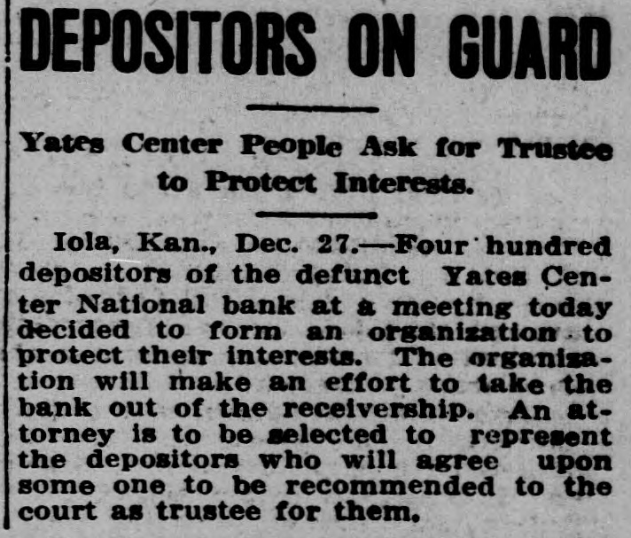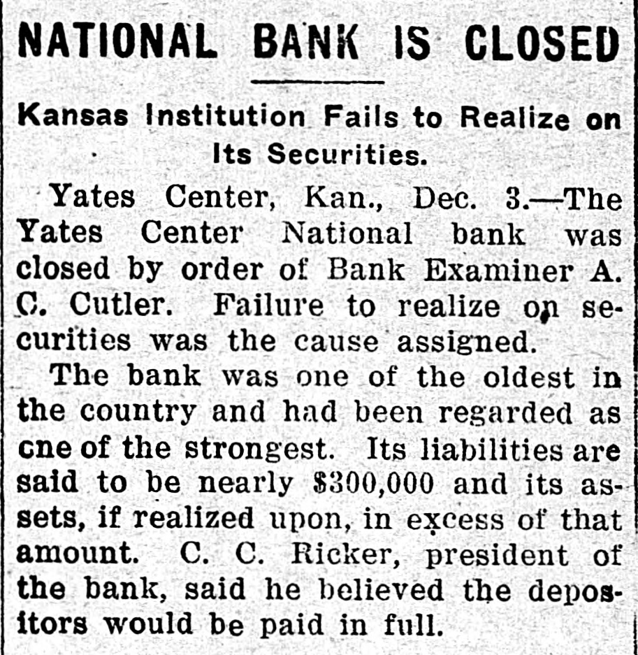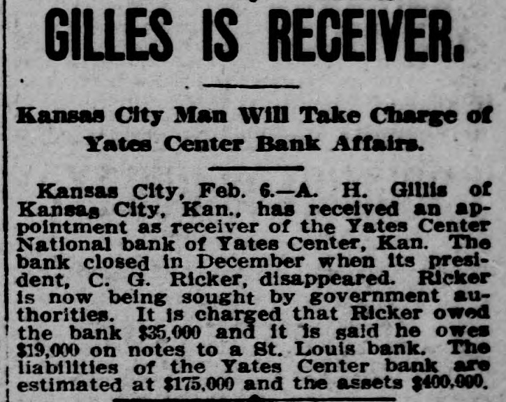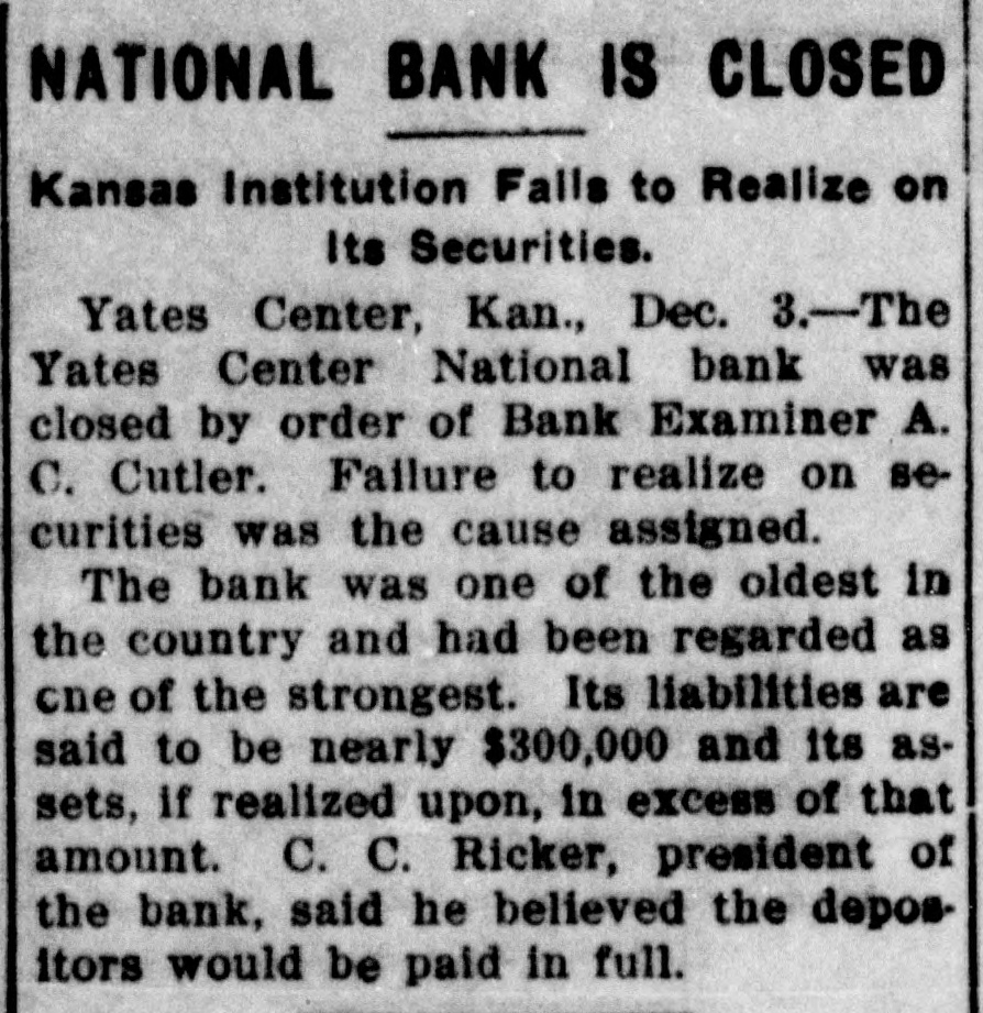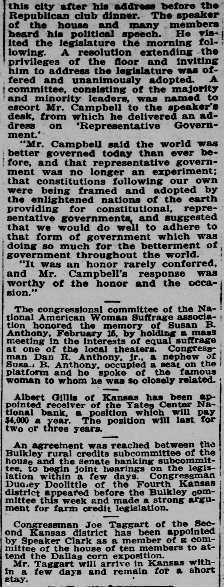 IS PASSED RICKER CASE Senate Approves Conference Echoes of Yates Center Bank Case Are Sad. Report on Currency Measure. It Now Goes to the President Widow Who Lost Her Allfor Signature. Ricker's Wife Destitute. FINAL VOTE STOOD 43 TO BELONGED TO CHURCH Three Republicans and One Had a Good Record Up to Bull Moose Join Majority. This Time. It Was Passed by the House His Son Is Loyal and Still Be298 to 60. lieves Father Will Pay. Washington, Dec. 3.-The conference New stories of the affairs of the report on the administration currency Yates Center National bank indicate bill was approved by the senate today that the condition of the institution is by a vote of 43 to 25. As the house even worse than at first reported and already had approved it there remain no one pretends to know the extent of ed only the signature of the vice presPresident Ricker's shortages and deident and the speaker to complete the falcations, although the total has been to measure for the president's signature. conservatively placed at $175,000 Three Republicans and Senator Poin$200,000. dexter, Progressive, joined the DemoAs the gossip of the affairs of the crats, voting for the bill in its final form. bank is told and retoid on the streets The Republicans were Senators Jones, of Yates Center, some new sensation is Norris and Weeks. The passage of the daily added to make conditions even report was greeted with little demonstration. worse than first reports indicated. R. Bristow Attacks the Bill. H. Trueblood, a director and stockWhen the senate debate began unholder in the bank, admits that the in- 25 stitution will not pay more than der the agreement to vote by 2:30 this afternoon, Senator Bristow, one of the per cent to the depositors. Other perRepublicans on the banking commitsons in touch with the affairs of the tee who had been denied admittance bank are inclined to believe that Trueblood's figures are too high. to the deliberation of the Democrat conferees, led off with an attack, say Nearly a quarter of a million dollars ing he proposed to express his opinof Woodson county farmers and merions where they would get into the cants' money is tied up in the bank permanent record. and its alleged assets. Ricker is gone The agreement placing the secreand the government is locking for him tary of the treasury, secretary of agwith a warrent charging him with falriculture and comptroller of the cursifying records and reports In their rency on the committee to organize home in Yates Center, Mrs. Ricker is a the new system, he declared, was alone and almost destitute, it is claimmove to bring the whole system uned. No one knows when the affairs der political control. (Continued on Page Six.) Arrangements for debate provided that Senators Bristow, Nelson and other Republicans who opposed the conference agreement would have IT MAY BE BLACK about three hours to talk. Senator Bristow declared he believed Senator Owen had excluded him from the conRumored That Rock Island Is ference for fear he would join some of the Democrats against Owen's "pet After Santa Fe Official. measures. "It was done because he knew he could not control my vote," cried Mr. Ripley Road May Lose Another Bristow, "as he could not control the votes of some of his Democratic colMan to Competitor. leagues, in the interests of certain great banking interests, that have had a hand throughout in framing this Following the announcement from bill. The senator from Oklahoma has Chicago to the effect that John Sebasaccepted the meet offensive provisions tian, the dean of railway passenger of the Aldrich bill and has covered had resigned as third vice presithem with a mask to deceive the people. men, dent of the Rock Island Lines, it is rumored persistently in Topeka today traffic Dose of Their Own Medicine. that W. J. Black. passenger asked Senator John Sharp Williams, declarmanager of the Santa Fe, will be affairs the passenger ing the Republicans were crying Rock the Island. to take charge of In view of the fact against the same sort of procedure they had always exercised, when in power, on that the Rock Island has taken over illustrated his point with a story of several Santa Fe department heads in a negro woman who had decried autothe last few years, it is considered very mobiles until she got a ride in one, and likely by Topeka railway men that the then admonished the driver: move may be followed out. 'Jedge, jes run right over dat man, instance look at the Rock Island he ain't got no business out in front staff For of Santa Fe trained men as it of our car. stands today: H. U. Mudge, president. "That's the way I feel about you Republicans. said he. J. E. Gorman, first vice president. Senator Townsend, Republican, atA.E. Sweet, general manager. C.A. Morse, chief engineer. tacked the bill. declaring it would reF. J. Easley, assistant general mansult in inflation. The measure shows the effect of the views of that Democratic leader who is now the ager. Any number of division superintendents and other minor officials are Santa distinguished secretary of state," he Fe trained men They were taken over said, "and those views, if carried to the Rock Island owing to the at conclusion, would inflate both curtractive by salaries offered by the road rency and credit to the breaking point. The policy of the Santa Fe in setting Senator Lewis, Democrat, defended certain limit on the salaries paid its officers a and the energy of the Rock Secretary Bryan and declared the ReIsland in taking advantage of this publican party had been forced to write into law many of the policies he policy by flattering offers, has given had advocated the latter road a trained set of offiSenator Shafroth, Democrat, decials with which to compete with its rival across the country between Chifended the procedure of the Democratic conferees. cago and the coast. House Passes It. It is believed by many railroad men that the Rock Island will not fill the Washington, Dec. 23. The house vacancy caused by th