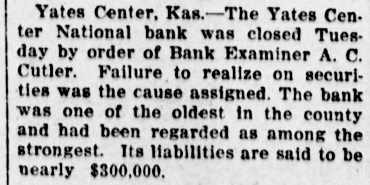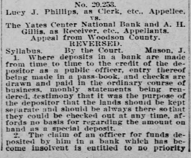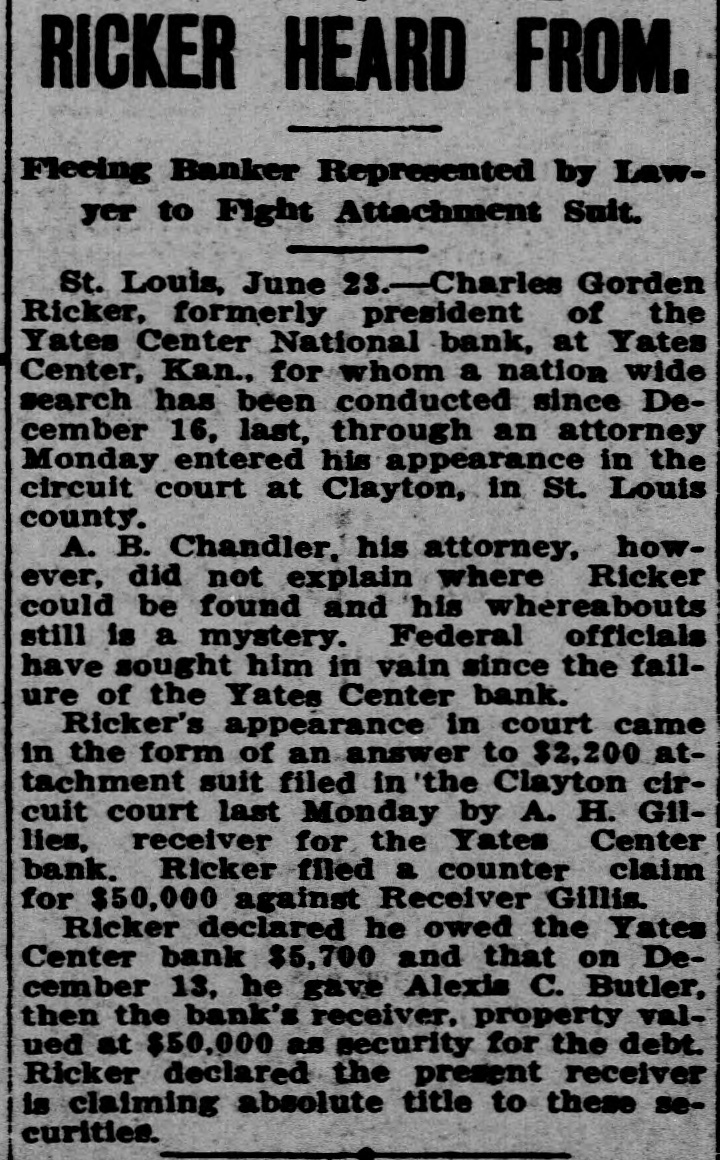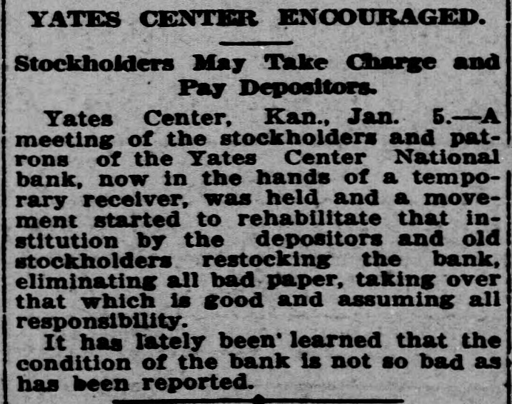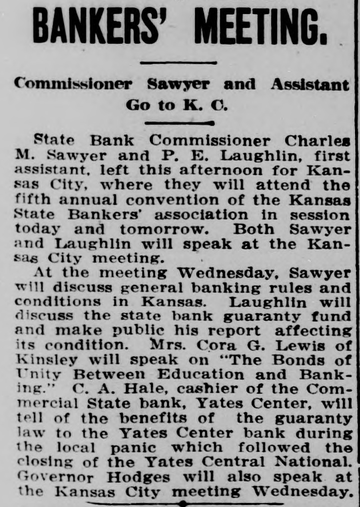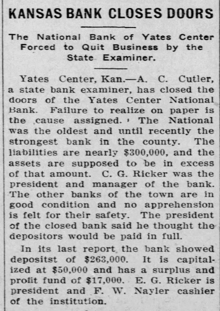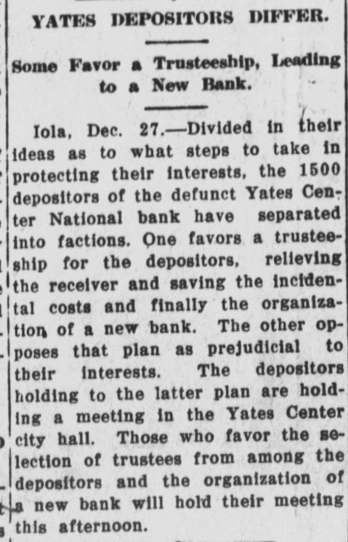 IS PASSED RICKER CASE Senate Approves Conference Echoes of Yates Center Bank Case Are Sad. Report on Currency Measure. It Now Goes to the President Widow Who Lost Her Allfor Signature. Ricker's Wife Destitute. FINAL VOTE STOOD 43 TO BELONGED TO CHURCH Three Republicans and One Had a Good Record Up to Bull Moose Join Majority. This Time. It Was Passed by the House His Son Is Loyal and Still Be298 to 60. lieves Father Will Pay. Washington, Dec. 3.-The conference New stories of the affairs of the report on the administration currency Yates Center National bank indicate bill was approved by the senate today that the condition of the institution is by a vote of 43 to 25. As the house even worse than at first reported and already had approved it there remain no one pretends to know the extent of ed only the signature of the vice presPresident Ricker's shortages and deident and the speaker to complete the falcations, although the total has been to measure for the president's signature. conservatively placed at $175,000 Three Republicans and Senator Poin$200,000. dexter, Progressive, joined the DemoAs the gossip of the affairs of the crats, voting for the bill in its final form. bank is told and retoid on the streets The Republicans were Senators Jones, of Yates Center, some new sensation is Norris and Weeks. The passage of the daily added to make conditions even report was greeted with little demonstration. worse than first reports indicated. R. Bristow Attacks the Bill. H. Trueblood, a director and stockWhen the senate debate began unholder in the bank, admits that the in- 25 stitution will not pay more than der the agreement to vote by 2:30 this afternoon, Senator Bristow, one of the per cent to the depositors. Other perRepublicans on the banking commitsons in touch with the affairs of the tee who had been denied admittance bank are inclined to believe that Trueblood's figures are too high. to the deliberation of the Democrat conferees, led off with an attack, say Nearly a quarter of a million dollars ing he proposed to express his opinof Woodson county farmers and merions where they would get into the cants' money is tied up in the bank permanent record. and its alleged assets. Ricker is gone The agreement placing the secreand the government is locking for him tary of the treasury, secretary of agwith a warrent charging him with falriculture and comptroller of the cursifying records and reports In their rency on the committee to organize home in Yates Center, Mrs. Ricker is a the new system, he declared, was alone and almost destitute, it is claimmove to bring the whole system uned. No one knows when the affairs der political control. (Continued on Page Six.) Arrangements for debate provided that Senators Bristow, Nelson and other Republicans who opposed the conference agreement would have IT MAY BE BLACK about three hours to talk. Senator Bristow declared he believed Senator Owen had excluded him from the conRumored That Rock Island Is ference for fear he would join some of the Democrats against Owen's "pet After Santa Fe Official. measures. "It was done because he knew he could not control my vote," cried Mr. Ripley Road May Lose Another Bristow, "as he could not control the votes of some of his Democratic colMan to Competitor. leagues, in the interests of certain great banking interests, that have had a hand throughout in framing this Following the announcement from bill. The senator from Oklahoma has Chicago to the effect that John Sebasaccepted the meet offensive provisions tian, the dean of railway passenger of the Aldrich bill and has covered had resigned as third vice presithem with a mask to deceive the people. men, dent of the Rock Island Lines, it is rumored persistently in Topeka today traffic Dose of Their Own Medicine. that W. J. Black. passenger asked Senator John Sharp Williams, declarmanager of the Santa Fe, will be affairs the passenger ing the Republicans were crying Rock the Island. to take charge of In view of the fact against the same sort of procedure they had always exercised, when in power, on that the Rock Island has taken over illustrated his point with a story of several Santa Fe department heads in a negro woman who had decried autothe last few years, it is considered very mobiles until she got a ride in one, and likely by Topeka railway men that the then admonished the driver: move may be followed out. 'Jedge, jes run right over dat man, instance look at the Rock Island he ain't got no business out in front staff For of Santa Fe trained men as it of our car. stands today: H. U. Mudge, president. "That's the way I feel about you Republicans. said he. J. E. Gorman, first vice president. Senator Townsend, Republican, atA.E. Sweet, general manager. C.A. Morse, chief engineer. tacked the bill. declaring it would reF. J. Easley, assistant general mansult in inflation. The measure shows the effect of the views of that Democratic leader who is now the ager. Any number of division superintendents and other minor officials are Santa distinguished secretary of state," he Fe trained men They were taken over said, "and those views, if carried to the Rock Island owing to the at conclusion, would inflate both curtractive by salaries offered by the road rency and credit to the breaking point. The policy of the Santa Fe in setting Senator Lewis, Democrat, defended certain limit on the salaries paid its officers a and the energy of the Rock Secretary Bryan and declared the ReIsland in taking advantage of this publican party had been forced to write into law many of the policies he policy by flattering offers, has given had advocated the latter road a trained set of offiSenator Shafroth, Democrat, decials with which to compete with its rival across the country between Chifended the procedure of the Democratic conferees. cago and the coast. House Passes It. It is believed by many railroad men that the Rock Island will not fill the Washington, Dec. 23. The house vacancy caused by th