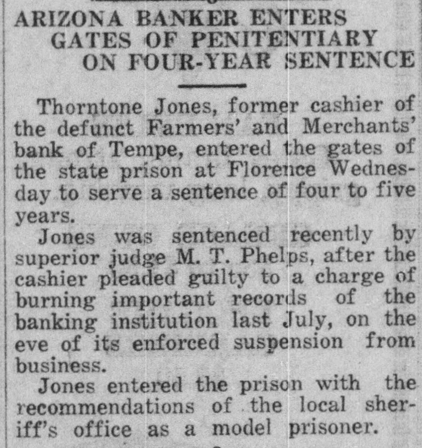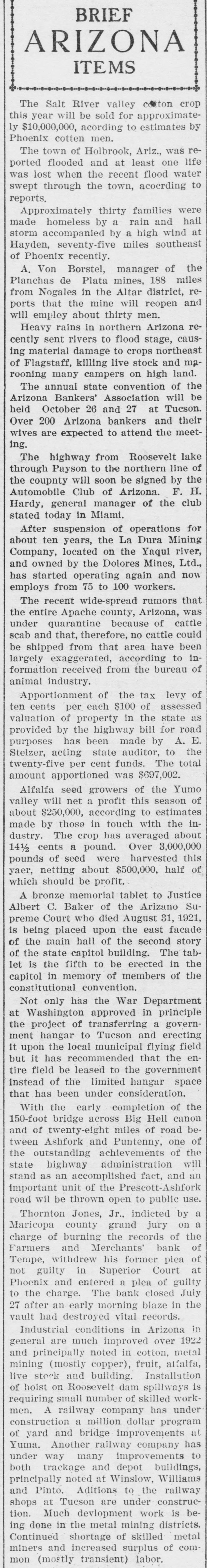 BRIEF ARIZONA ITEMS The Salt River valley cotton crop this year will be sold for approximate- by ly $10,000,000, acording to estimates Phoenix cotten men. The town of Holbrook, Ariz., was reported flooded and at least one life was lost when the recent flood water to swept through the town, acocrding reports, Approximately thirty families were hail made homeless by a rain and storm accompanied by a high wind at Hayden, seventy-five miles southeast of Phoenix recently. A. Von Borstel, manager of the Planchas de Plata mines, 188 miles from Nogales in the Altar district, and reports that the mine will reopen will employ about thirty men. rains in northern Arizona resent rivers to flood cently Heavy stage, northeast causmaterial damage to crops of killing live stock mamany campers on rooning ing Flagstaff, high and land. state convention of the Bankers' Association Arizona The annual Tucson. will be held October 26 and 27 at Over 200 Arizona bankers and their wives are expected to attend the meeting. The highway from Roosevelt lake through Payson to the northern line of the coupnty will soon be signed by the Automobile Club of Arizona. F. H. Hardy, general manager of the club stated today in Miami. After suspension of operations for about ten years, the La Dura Mining located on the by the Dolores and Company, owned Yaqui Mines, and river, Ltd., now has started operating again employs from 75 to 100 workers. The recent wide-spread rumors that the entire Apache county, Arizona, was under quarantine because of cattle scab and that, therefore, no cattle could be from that area have largely shipped exaggerated, according bureau to been in- of formation received from the animal industry. Apportionment of the tax levy of per each $100 of assessed of property in the as ten valuation cents for state road provided by the highway bill has been made by A. E. state to Stelzer, purposes acting auditor, The total the twenty-five per cent funds. amount apportioned was $697,002. Alfalfa seed growers of the Yumo will net a profit this season of about according to valley $250,000, with estimates the inmade by those in touch dustry. The crop has averaged about 141/2 cents a pound. Over 3,000,000 of seed were harvested this netting about $500,000, which should be yaer, pounds profit. half of A bronze memorial tablet to Justice Albert C. Baker of the Arizano SuCourt who died August 31, 1921, is placed upon the hall of the of preme being the main second east facade story of the state capitol building. The tablet is the fifth to be erected in the capitol in memory of members of the constitutional convention. Not only has the War Department at Washington approved in principle the project of transferring a government hangar to Tucson and erecting it upon the local municipal flying field but it has recommended that the entire field be leased to the government instead of the limited hangar space that has been under consideration. With the early completion of the 150-foot bridge across Big Hell canon and of twenty-eight miles of road between Ashfork and Puntenny, one of the outstanding achievements of the state highway administration will stand as an accomplished fact, and an unit of the important Prescott-Ashfork public use. road wil be thrown open to Jones, Jr., a county grand Maricopa Thornton indicted jury of by on the a charge of burning the records Farmers and Merchants' bank of Tempe, withdrew his former plea of not guilty in Superior Court at Phoenix and entered a plea of guilty to the charge. The bank closed July 27 after an early morning blaze in the vault had destroyed vital records. Industrial conditions in Arizona in general are much improved over 1922 and principally noted in cotton, metal mining (mostly copper), fruit, alfalfa, live stock and building. Installation of hoist on Roosevelt dam spillways is requiring small number of skilled workmen. A railway company has under construction a million dollar program of yard and bridge improvements at Yuma. Another railway company has under way many improvements to both trackage and depot buildings, principally noted at Winslow, Williams Pinto. Aditions to the railway at Tucson are under tion. Much devlopment and shops work construc- districts. is bedone in the metal mining shortage of and increased surplus comContinued miners ing skilled of metal mon (mostly transient) labor.