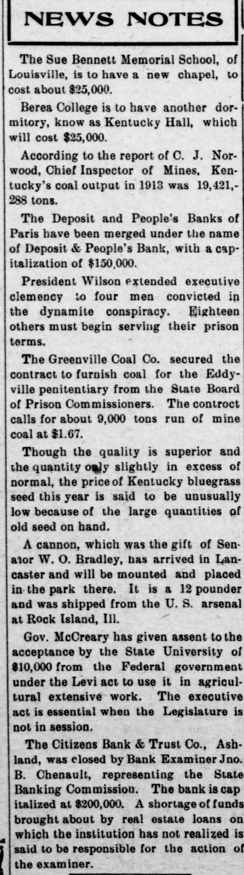 NEWS NOTES The Sue Bennett Memorial School, of Louisville, is to have a new chapel, to cost about $25,000. Berea College is to have another dormitory, know as Kentucky Hall, which will cost $25,000. According to the report of C. J. Norwood, Chief Inspector of Mines, Kentucky's coal output in 1913 was 19,421,288 tons. The Deposit and People's Banks of Paris have been merged under the name of Deposit & People's Bank, with a capitalization of $150,000. President Wilson extended executive clemency to four men convicted in the dynamite conspiracy. Eighteen others must begin serving their prison terms. The Greenville Coal Co. secured the contract to furnish coal for the Eddyville penitentiary from the State Board of Prison Commissioners. The controct calls for about 9,000 tons run of mine coal at $1.67. Though the quality is superior and the quantity only slightly in excess of normal, the price of Kentucky bluegrass seed this year is said to be unusually low because of the large quantities of old seed on hand. A cannon, which was the gift of Senalor W. O. Bradley, has arrived in Lancaster and will be mounted and placed in the park there. It is a 12 pounder and was shipped from the U.S. arsenal at Rock Island, Ill. Gov. McCreary has given assent to the acceptance by the State University of $10,000 from the Federal government under the Levi act to use it in agricultural extensive work. The executive act is essential when the Legislature is not in session. The Citizens Bank & Trust Co., Ashland, was closed by Bank Examiner Jno. B. Chenault, representing the State Banking Commission. The bank is cap italized at $200,000. A shortage of funds brought about by real estate loans on which the institution has not realized is said to be responsible for the action of the examiner.