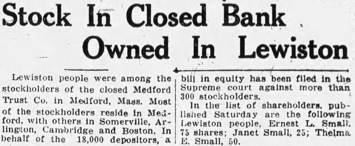 Lewiston people were among the stockholders of the closed Medford Trust Co. in Medford, Mass. Most of the stockholders reside in Medothers lington, Boston. In behalf of the 18,000 depositors, bill in equity has been filed in the against more than 300 stockholders. In list of shareholders. published Saturday are the following Lewiston people, Ernest Small shares; Janet Small, 25; Thelma Small,