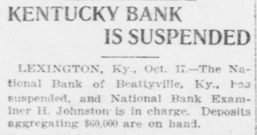 KENTUCKY BANK IS SUSPENDED LEXINGTON, Ky., Oct. 17.-The National Bank of Beattyville, Ky., 103 suspended, and National Bank Examiner H. Johnston is in charge. Deposits aggregating $60,000 are on hand.