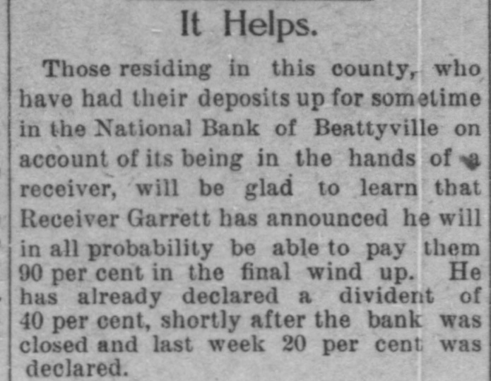 It Helps. Those residing in this county, who have had their deposits up for sometime in the National Bank of Beattyville on account of its being in the hands of a receiver, will be glad to learn that Receiver Garrett has announced he will in all probability be able to pay them 90 per cent in the final wind-up. He has already declared a divident of 40 per cent, shortly after the bank was closed and last week 20 per cent was declared.