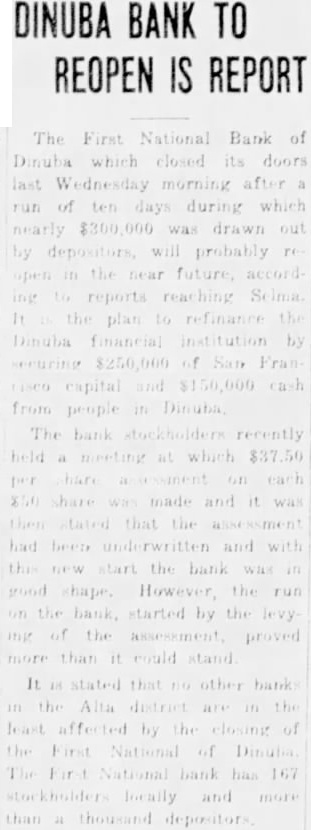 DINUBA BANK TO REOPEN IS REPORT National Bank of its doors of probably in the Dinuba by of from The and been and by assessment proved more than the closing National of bank has 167 locally and thousand depositors