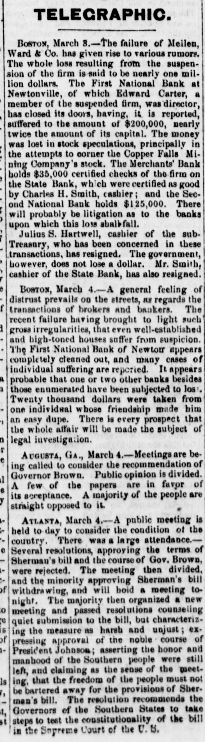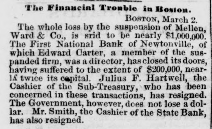 BANK TROUBLES, DEFALCATIONS AND ERAUDS. First National Bank of Hudson. N. Y. HUDSON, N. Y., March 2, 1867. The First National Bank of this city was closed to day for examination of accounts, it being alleged that Peter S. Wynkoop, the cashier, is a defaulter to a large amount. The directors of the bank are investigating the matter, and will report the amount of deficiency as soon as ascertained. The cashier makes a clean breast of it, and acknowledges that he has lost heavily by speculations in fancy stocks. The following notice was posted on the doors of the bank to-day:The board of directors of the First National Bank of Hudson are pained to inform the public that owing to known defalcations of the cashier of that institution they are compelled to close its doors until a full examination of its condition can be made. Notwithstand. ing the frank confession of the late cashier it is impossible at this moment, from the absence of proper data, and the state of the cashier's mind, to determine what is the actual amount of the defalcations; but from present appearances they are thought to be such as to imparir only a minor part of the capital. The board have every confidence in assuring depositors that they are amply secured. Bill holders, of course, have nothing to fear. Valuables deposited for safe keeping are believed to be untouched. Every means in the power of the board will be used to relieve depositors from their unfortunate situations. At the earliest mement a statement of the affairs of the bank will be made. J. W. FAIRFIELD, President. An investigation into the affairs of the bank shows as embezzlement of about $50,000. A further examina. tion will doubtless increase the amount. Hasbrouck, the defaulting cashier, was taken into custody this evening at the instance of the president of the bank and lodged in jail. The above bank has a paid in capital of $200,000, and power to increase to half a million. Its notes are no. deemed at the Ninth National Bank of New York city. First National Bank of Newton, Mass. BOSTON, March 2, 1867. There is great trouble in financial circles here. E. Porter Dyer, Jr., the cashier of the First National Bank of Newton, Mass., is short $110,000 The President of the bank gave notice that the cashier came to Boston yesterday at eleven o'clock and has not since been heard of. The paid in capital of the bank is only $150,000, but it has authority to increase its stock to $300,000. It redeems in New York at the National Park Bank. Swindling the Dollar Savings Bank of Pitte. burg, Pa. Relative to the embezzlement of some $15,000 CODEmitted by A. V. H. Elder, general bookkeeper of the Dollar Savings Bank at Pittsburg, the Post of that city has the following:The occasion of the discovery of the fraud was as follows:-A gentleman, whose name we forbear making public, received a small patrimony, amounting to some $700, which he deposited in the Dollar Savings Bank for safe keeping. The sum was correctly entered upon the depositor's bankbook, but upon the credit book in the bank it was set down $200, the bookkeeper pocketing the other $500. In a short time the depositor wished to check for $200, whereupon the teller asked him if he would not have his account balanced. He replied in the negative, stating that he still had some $500 on deposit, when be was requested to leave his book for settlement. This was done. The discrepancy was discovered and suspicion aroused. The directors were informed, other pass books were sent for and accounts settled, in which similar errors were found to exists. A thorough investigation took place, and deficits to the above amount were found. State Bank of Massachusetts-Over Half a Million Dollars Involved. BOSTON, March 2, 1867. There was considerable excitement in State street this morning occasioned by the development of the irregularities in transactions of the cashier of the State Bank in regard to certification of checks as "good" bearing the name of Mellen, Ward & Co., brokers, who suspended payment yesterday. These checks were presented at the Clearing House at the morning settlement by the various banks holding the same and were thrown out by the State Bank, on which certifications were made. The directors of the institution declare that they never entered into, or agreed to any arrangement made with the city banks for the certification of checks, and such action of their cashier was wholly unauthorized by them. The sum involved in these transactions is upwards of half a million dollars. Other parties besides those mentioned are also implicated in these diffculties.