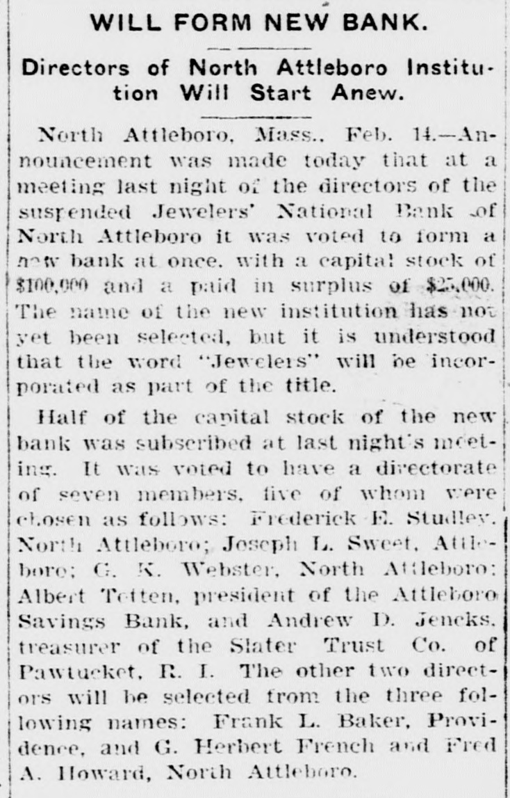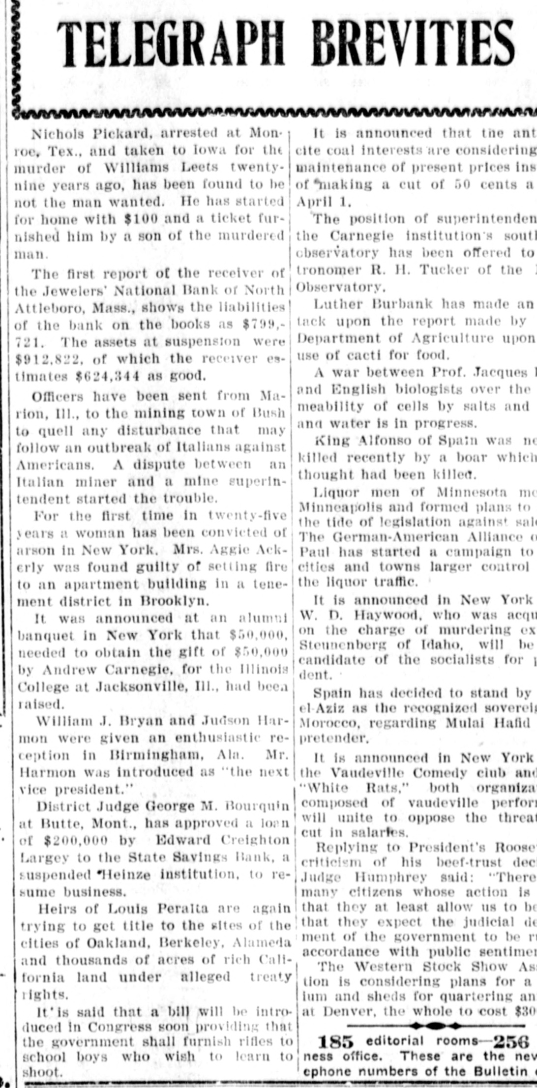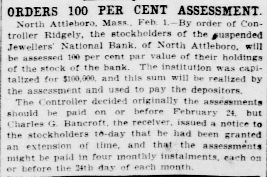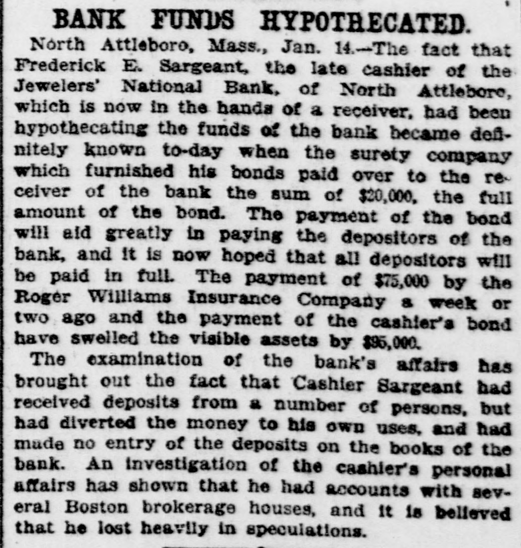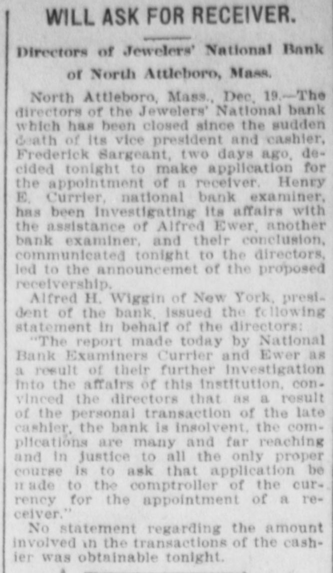 FINANCIAL Jan. 21-Merchants' and Farmers' bank of Fairmont, Minn., suspended. Feb. 2-F. D. Gilman, former president suspended Home bank of Goodland, Ind., found guilty of embezzlement. 8-F. D. Gilman, Indiana banker. sentenced to term of one to three years in state prison. -Disappearance of $173,000 from subtreasury at Chicago made public. Mar. 14-Virtual panic in Wall street: Secretary Cortelyou relieved the situation. 19-Citizens' State bank of Firth, Neb., closed by state. 28-Corbin Banking company of New York, assigned; assets, $3,000,000; liabilities, $1,700,000. Apr. 2-Maj. H. W. Salmon of Warsaw, Mo., convicted of illegal banking, sentenced three years in penitentiary. 11-Bank of Conception, at Clyde, Mo., ordered closed. 19-Ex-Judge Smith of Chicago, found guilty of conspiring to defraud stockholders and depositors of Bank of America, of which he was president; penalty, imprisonment and $1,000 fine. Jul. 1-Citizens' bank of Eureka Springs, Ark., suspended. 5-Fort Dallas National bank of Miami, Fla., closed. 20-Farmers' National bank of Boyertown, Pa., ordered closed. Aug. 3-People's State bank of Brownstown, Ind., closed by state authorities. M-Receivers appointed for Pope Mfg. Co., of Hartford, Conn.: failure ascribed to stringency of money market. Sep. 5-Watson & Co., members of New York stock and produce exchanges and of Chicago board of trade, failed. Oct. 9-Union bank of Richland, and Bowman bank of Kalamazoo, Mich., both private Institutions, closed doors. 16-Collapse of Heinze corner in copper caused violent slump in stocks in New York: firm of Otto Heinze & Co., suspended from stock exchange. 19-New York clearing house committee declared that the Heinze, Morse and Thomas interests had been eliminated from banking organizations of New York. 22-Knickerbocker Trust Co., New York's second largest financial institution, forced to suspend; great slump in securities: call money at 70 per cent. 23-Secretary of treasury ordered deposit of $25,000,000 of government funds in New York banks. Four Westinghouse companies at Pittsburg and one trust company forced into hands of receivers because of financial stringency State Bank and Trust Co., of Carson, Nevada, failed. M-Three minor banks in New York forced to close Southern Steel Co., of Birmingham, Ala., filed involuntary petition in bankruptcy. 25-Six more minor banking institutions in New York closed doors. Union Trust Co., of Providence, R. I., suspended. Banks in New York and Chicago, and many other cities adopted clearing house loan certificate system to prevent draining of supplies of currency and made withdrawal of savings deposits subject to legal notice. $0-California Safe Deposit & Trust Co. bank, at San Francisco, closed Financial conditions in New York practically normal again. Nov. 4-Three small banks in Kansas closed United States Steel corporation secured controlling Interest in Tennessee Coal & Iron Co. -Receiver appointed for Arnold Print works of North Adams, Mass., one of largest textile concerns in country. 12-Merchants' National bank of Portland, Ore., California bank of Oakland, Cal. and Farmers' & Merchants' bank of Bapulpa, I.T., suspended. as Secretary of Treasury Cortelyou ordered issue of $50,000,000 of Panama bonds and $100,000,000 certificates of indebtedness as means of relieving financial situation City National bank of Frederick, Okla., failed. 17-American Silk Co. capital stock, $11,000,000, which operated mills in several cities, placed in hands of receiver. Dec. Chelsea Savings abnk of Chelsea, Mich., owned by State Treasurer Glazier, closed. -National Bank of Commerce, one of largest financial institutions of Kansas City, suspended. Fort Pitt National bank of Pittsburg, closed. l7-Jewelers' National bank at North Attleboro, Mass., in hands of receiver.