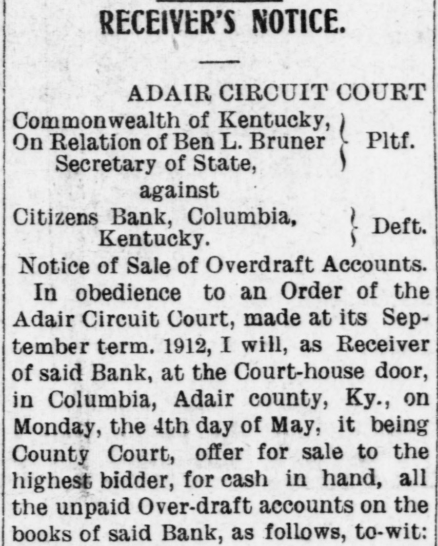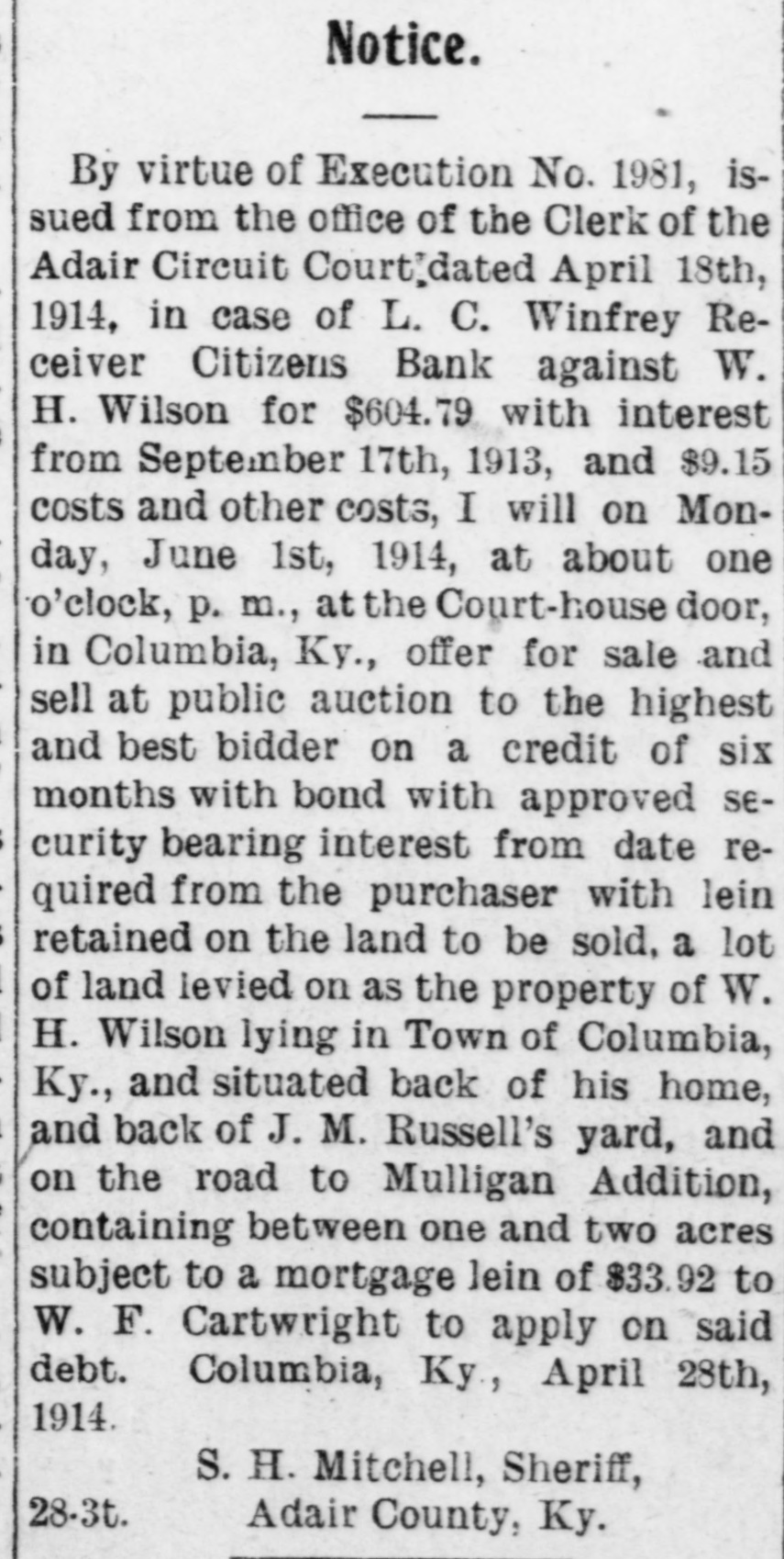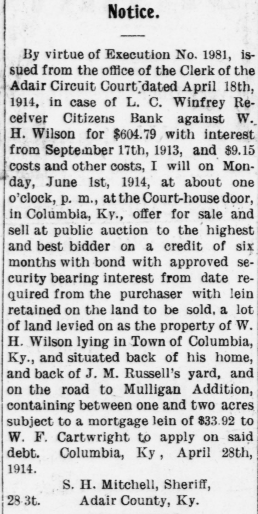 Notice. I By virtue of Execution No 1981, issued from the office of the Clerk of the Adair Circuit Court on the 18th day of April, 1914,, in suit of L. C. Winfrey Receiver Citizens Bank against W, H. Wilson for the sum of six hundred and four dollars and seventy-nine cents, ($604.79,) with six per cent. interest from the 17th day of September, 1913, and nine dollars and fifteen cents ($9.15) costs and Sheriff's commission, and other costs, I will offer for sale and sell to the highest and best bidder at the Court-house door in Columbia, Ky., on May 16th, 1914, at about one o'clock, p. m., on a credit of six months bearing interest from date with approved security required from the purchaser and a lien is retained on the land sold herein, the following tract or parcel of land levied on as the property of W. H. Wilson subject to a mortgage lien of about $33 92 in favor of W. F. Cartwright, and a public road or street 20 feet wide on the East side of said land. Said land to be sold lies in the Town of Columbia, Ky., and is bounded as follown: On the North by the public road leading to the Mulligan Addition; on the East side by the public road or street 20 feet wide and not included in this sale; on the South by the lands of J. M. Russell; on the West by the lands of W. H. Wilson. Said land containing about 11 acres more or less. Columbia, Ky, April 25th, 1914. S. H Mitchell, Sheriff, 26-3t. Adair County, Ky.