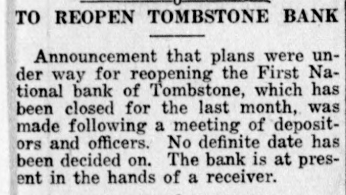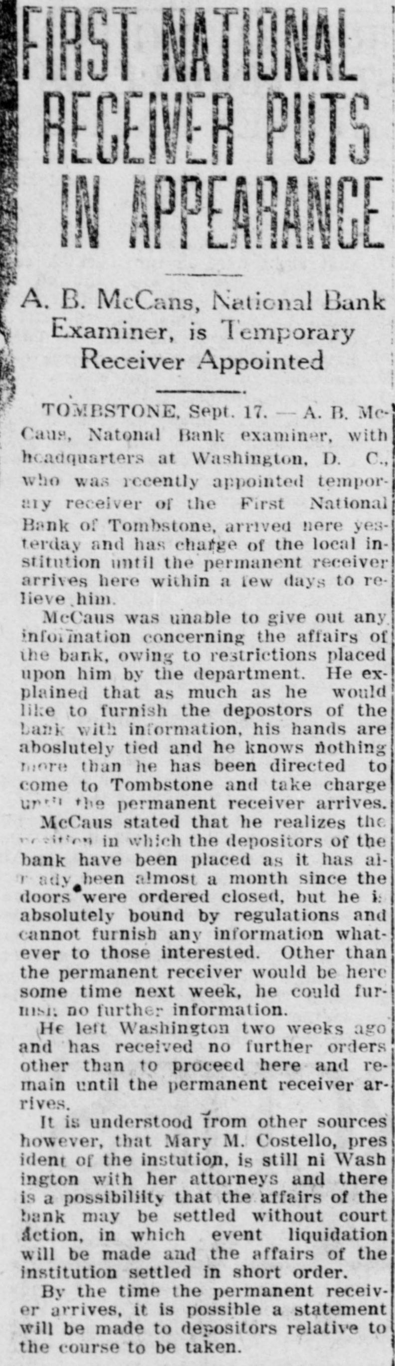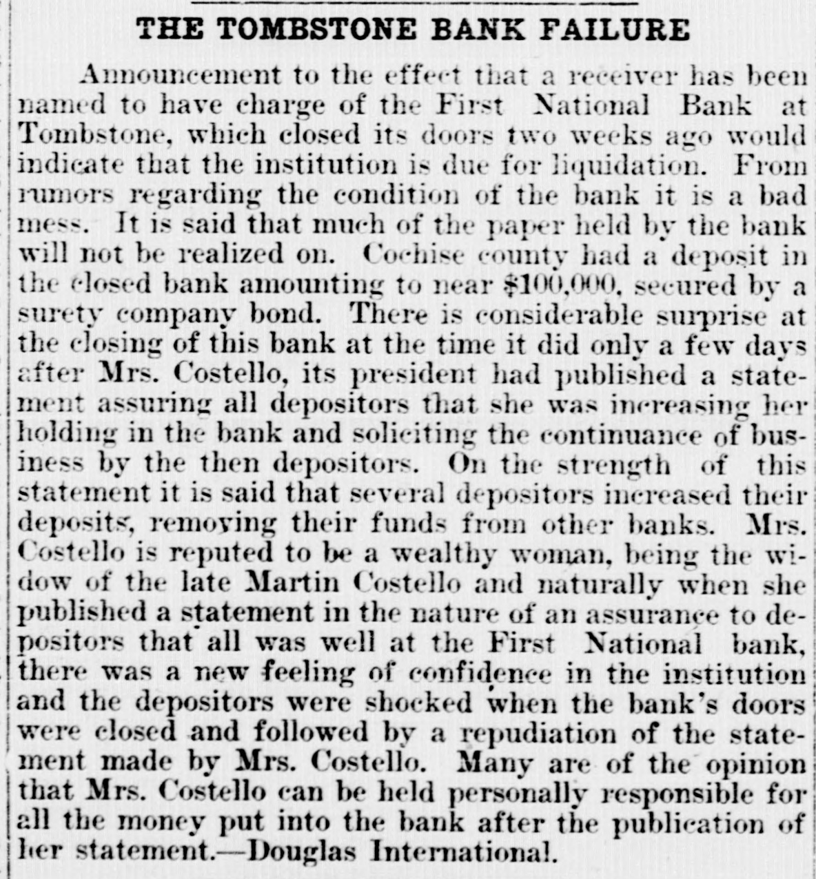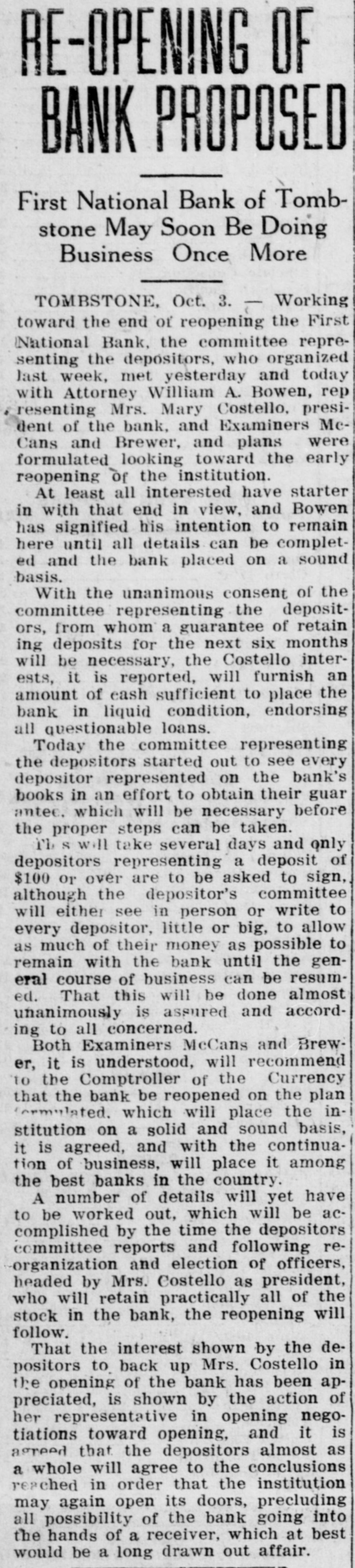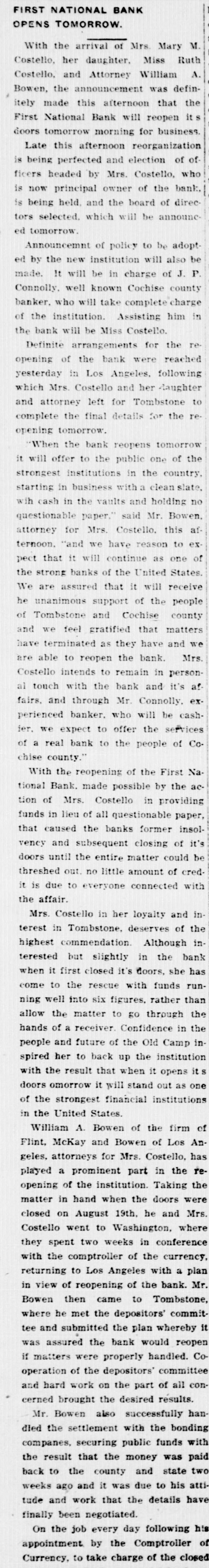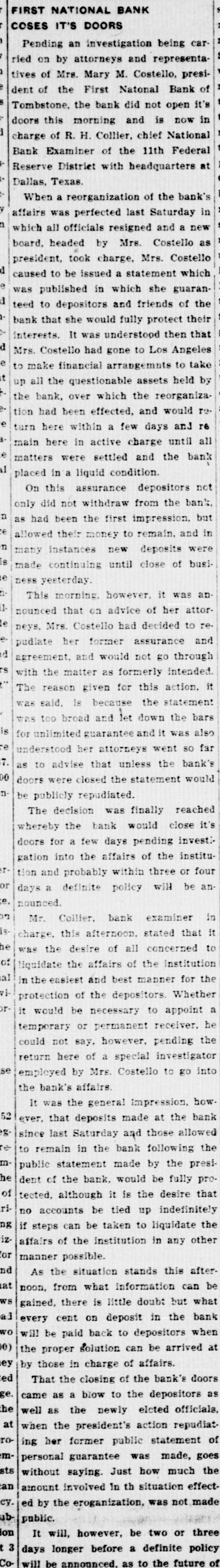 FIRST NATIONAL BANK COSES IT'S DOORS Pending an investigation being carried on by attorneys and representatives of Mrs. Mary M. Costello, president of the First Natonal Bank of Tombstone, the bank did not open it's doors this morning and is now in charge of R. H. Collier, chief National Bank Examiner of the 11th Federal Reserve District with headquarters at Dallas, Texas. When a reorganization of the bank's affairs was perfected last Saturday in which all officials resigned and a new board, headed by Mrs. Costello as president, took charge. Mrs. Costello d caused to be issued a statement which e was published in which she guarand teed to depositors and friends of the bank that she would fully protect their interests. It was understood then that d Mrs. Costello had gone to Los Angeles e to make financial arrangemnts to take t up all the questionable assets held by the bank, over which the reorganization had been effected, and would ree turn here within a few days and r6 main here in active charge until all e matters were settled and the bank il placed in a liquid condition. On this assurance depositors not only did not withdraw from the bank n as had been the first impression, but e allowed their money to remain. and in n many instances new deposits were 8 made continuing until close of busie ness yesterday 0 This morning. however, it was an1nounced that on advice of her attorle neys, Mrs. Costello had decided to repudiate her former assurance and d agreement, and would not go through rs with the matter as formerly intended. The reason given for this action. it was said, is because the statement was too broad and let down the bars is for unlimited guarantee and it was also re understood her attorneys went SO far 7. as to advise that unless the bank's 00 doors were closed the statement would nbe publicly repudiated. The decision was finally reached whereby the bank would close it's doors for a few days pending invest: gation into the affairs of the instituand probably within three or four or tion will be andays a definite policy e nounced. on Mr. Collier. bank examiner in 3. charge, this afternoon. stated that it he was the desire of all concerned to of liquidate the affairs of the institution al in the easiest and best manner for the viprotection of the depositors. Whether or a it would be necessary to appoint temporary or permanent receiver, he could not say, however, pending the se return here of a special investigator into employed by Mrs. Costello to go the bank's affairs. It was the general impression, how 52 ever, that deposits made at the bank g since last Saturday and those allowed reto remain in the bank following the m public statement made by the presihe dent of the bank. would be fully proof tected, although it is the desire that rino accounts be tied up indefinitely pg if steps can be taken to liquidate the izaffairs of the institution in any other for manner possible. nd As the situation stands this afterat noon, from what information can be ws gained, there is little doubt but what al every cent on deposit in the bank wo will be paid back to depositors when 0) the proper solution can be arrived at ey by those in charge of affairs. ed That the closing of the bank's doors ge. came as a blow to the depositors as the well as the newly eleted officials, at when the president's action repudiatro ing her former public statement of mpersonal guarantee was made, goes sts without saying. Just how much the an amount involved in th situation effectcy. ed by the eroganization, was not made ubpublic. ion It will, however, be two or three 3 days longer before a definite policy Cowill be announced. as to the future of
