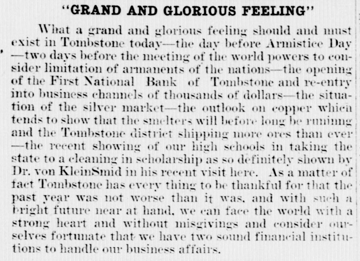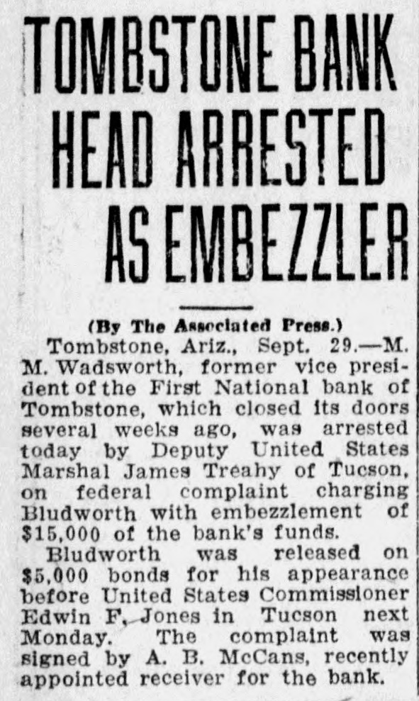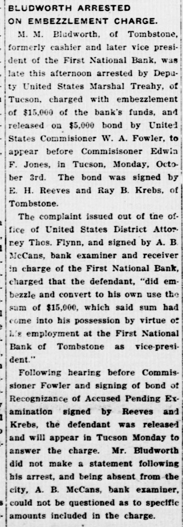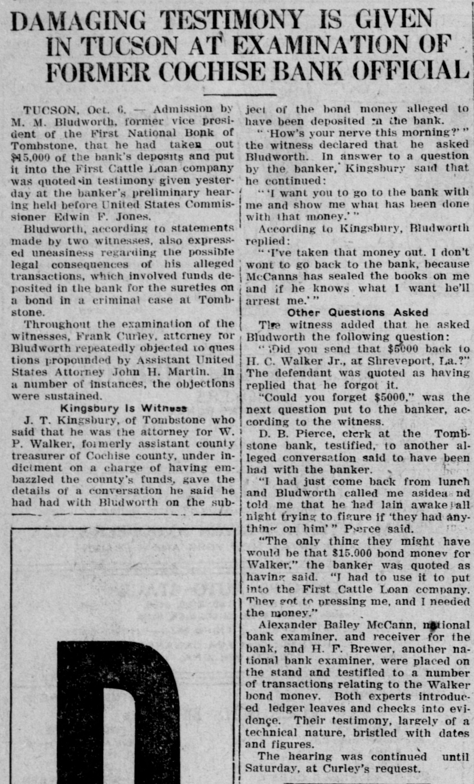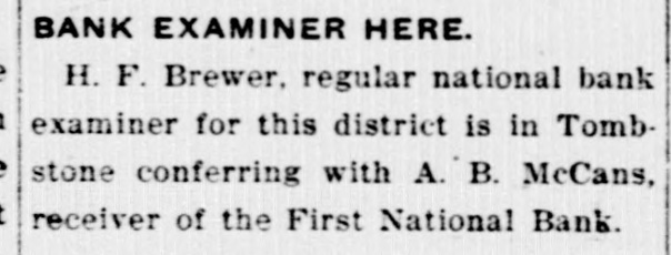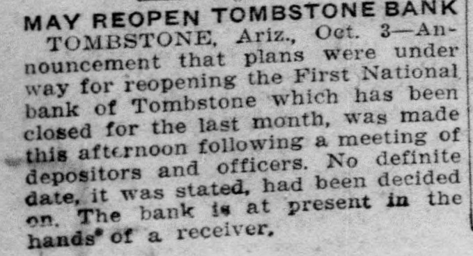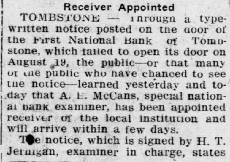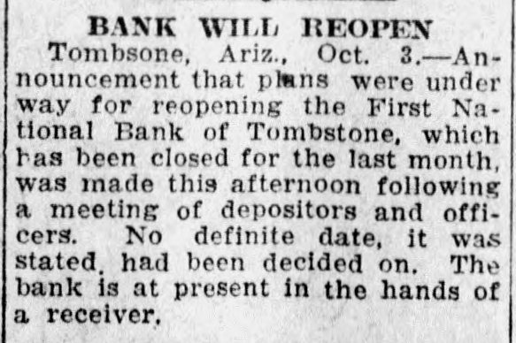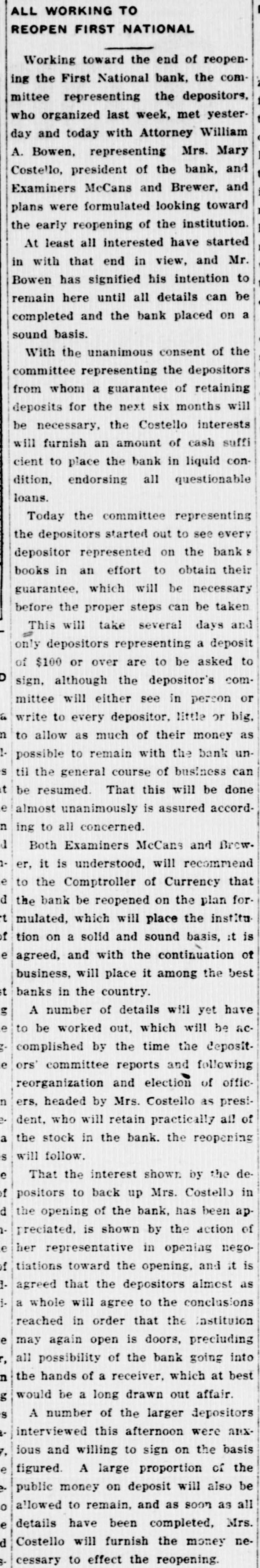 FIRST NATIONAL BANK COSES IT'S DOORS Pending an investigation being carried on by attorneys and representatives of Mrs. Mary M. Costello, president of the First Natonal Bank of Tombstone, the bank did not open it's doors this morning and is now in charge of R. H. Collier, chief National Bank Examiner of the 11th Federal Reserve District with headquarters at Dallas, Texas. When a reorganization of the bank's affairs was perfected last Saturday in which all officials resigned and a new board, headed by Mrs. Costello as president, took charge. Mrs. Costello d caused to be issued a statement which e was published in which she guarand teed to depositors and friends of the bank that she would fully protect their interests. It was understood then that d Mrs. Costello had gone to Los Angeles e to make financial arrangemnts to take t up all the questionable assets held by the bank, over which the reorganization had been effected, and would ree turn here within a few days and r6 main here in active charge until all e matters were settled and the bank il placed in a liquid condition. On this assurance depositors not only did not withdraw from the bank n as had been the first impression, but e allowed their money to remain. and in n many instances new deposits were 8 made continuing until close of busie ness yesterday 0 This morning. however, it was an1nounced that on advice of her attorle neys, Mrs. Costello had decided to repudiate her former assurance and d agreement, and would not go through rs with the matter as formerly intended. The reason given for this action. it was said, is because the statement was too broad and let down the bars is for unlimited guarantee and it was also re understood her attorneys went SO far 7. as to advise that unless the bank's 00 doors were closed the statement would nbe publicly repudiated. The decision was finally reached whereby the bank would close it's doors for a few days pending invest: gation into the affairs of the instituand probably within three or four or tion will be andays a definite policy e nounced. on Mr. Collier. bank examiner in 3. charge, this afternoon. stated that it he was the desire of all concerned to of liquidate the affairs of the institution al in the easiest and best manner for the viprotection of the depositors. Whether or a it would be necessary to appoint temporary or permanent receiver, he could not say, however, pending the se return here of a special investigator into employed by Mrs. Costello to go the bank's affairs. It was the general impression, how 52 ever, that deposits made at the bank g since last Saturday and those allowed reto remain in the bank following the m public statement made by the presihe dent of the bank. would be fully proof tected, although it is the desire that rino accounts be tied up indefinitely pg if steps can be taken to liquidate the izaffairs of the institution in any other for manner possible. nd As the situation stands this afterat noon, from what information can be ws gained, there is little doubt but what al every cent on deposit in the bank wo will be paid back to depositors when 0) the proper solution can be arrived at ey by those in charge of affairs. ed That the closing of the bank's doors ge. came as a blow to the depositors as the well as the newly eleted officials, at when the president's action repudiatro ing her former public statement of mpersonal guarantee was made, goes sts without saying. Just how much the an amount involved in th situation effectcy. ed by the eroganization, was not made ubpublic. ion It will, however, be two or three 3 days longer before a definite policy Cowill be announced. as to the future of