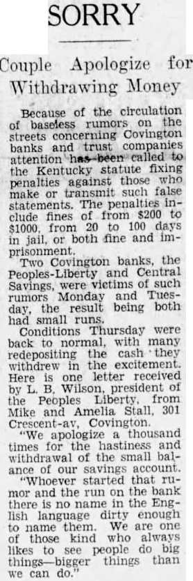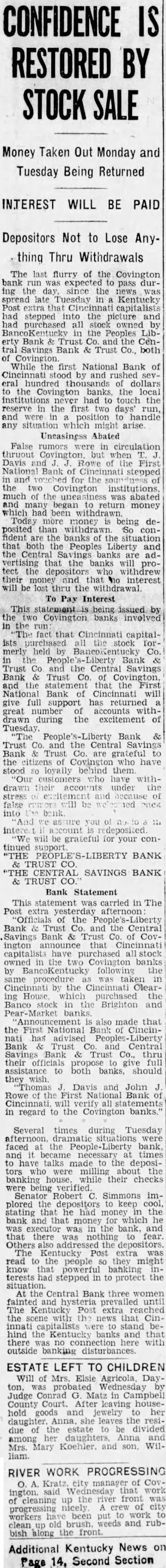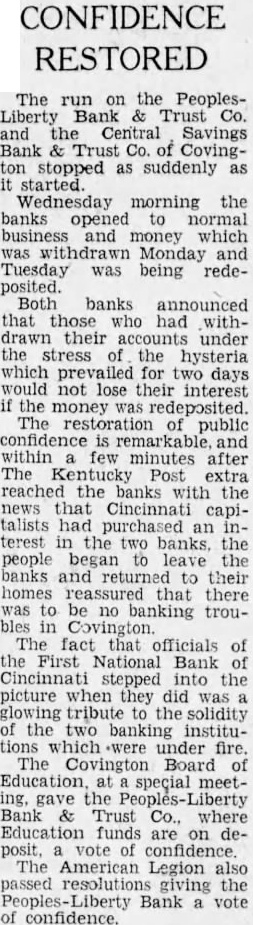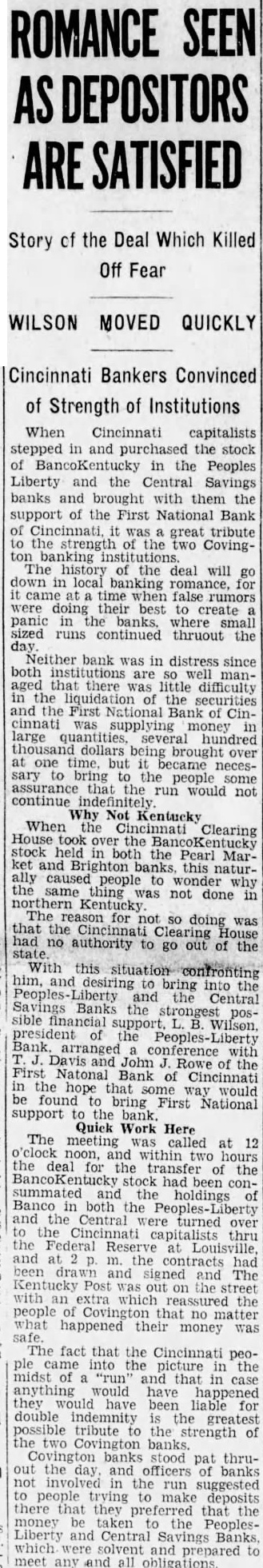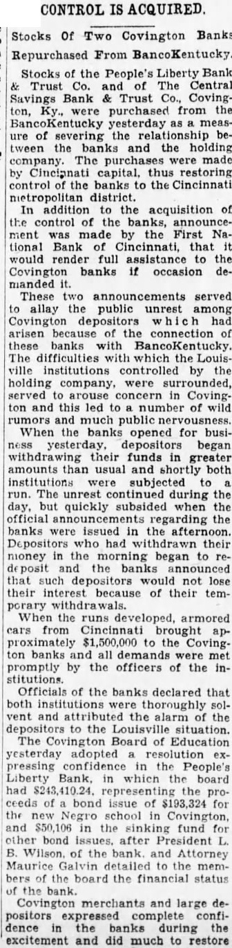 CONTROL ACQUIRED. Stocks Of Two Covington Banks Repurchased From Stocks of the People's Liberty Bank Trust The Central Savings Trust Covingpurchased from the yesterday ure of relationship tween the banks the holding company. purchases were made Cincinnati capital, thus restoring control the banks to the Cincinnati metropolitan district. In addition acquisition control of the banks, ment made First tional Bank Cincinnati, that would render full assistance Covington banks occasion manded These served allay public unrest Covington depositors had arisen connection these banks difficulties which the institutions holding company, were surrounded, ton and this led and When the banks opened for busidepositors began funds in greater amounts usual both institutions unrest during quickly subsided when the official banks issued Depositors their money morning began such would not lose their interest because of their temporary When the runs armored from Cincinnati brought proximately to the ton banks and demands were met promptly by the officers of the stitutions. Officials of the banks declared that institutions thoroughly and attributed the alarm the depositors the Louisville Covington Board of Education adopted resolution the People's Liberty Bank, which the had the issue $193,324 the school and the fund other bond after the bank and Attorney the the board the financial status the bank Covington merchants and positors dence banks during excitement and did much to restore