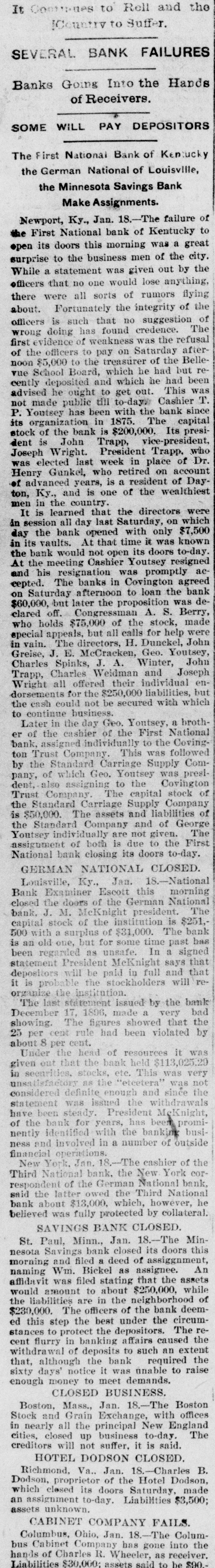 and to Rell It Country to suffer. SEVERAL BANK FAILURES of Receivers. Banks Going Into the Hands SOME WILL PAY DEPOSITORS First National Bank of Louisville, Kentucky The the German National of Bank the Minnesota Savings Make Assignments. of 18. The failure Newport, National Ky., Jan. bank of Kentucky a great to the First its doors this morning men was of the city. surprise open to the business given out by the While a statement was would lose anything, officers that no one of rumors flying of about. there were Fortunately all sorts the no integrity suggestion of The the such that credence. wrong officers doing is of has weakness found Saturday was the refusal afterfirst evidence pay on the Belle$5,000 to the which he had had been noon of the School officers Board, to and treasurer which he of but revue deposited get out. This was T. cently ought to Cashier advised made he public till with to-day the bank capital since P. not Youtsey has been in 1875. The Its presistock its organization of the bank Trapp. is $200,000. vice-president, who is John President Trapp. of Dr. who dent Joseph elected Wright. last week retired in place on account of DayKy., and is of Henry was advanced Gunkel, years, one is a of resident the wealthiest ton, in the country. the directors which were men It is learned that last Saturday, on $7,500 in was session all day opened with only known day vaults. At that its doors in its would not Youtsey acthe bank the meeting bank Cashier open time promptly it resigned to-day. agreed At and the his resignation banks in was Covington the bank cepted. The afternoon to loan was deon Saturday later the proposition S. Berry, off. the stock, clared holds $75,000 of calls for help special appeals, directors, H. Geo. $60,000, who but Congressman but all Dunckel, A. Youtsey, made John were in vain. J. The E. McCracken, Winter, John Spinks, Weidman J. and Trapp, all offered their liabilities, Greise, Charles Wright Charles $250,000 A. individual Joseph which en- but dorsements could for the not be secured with broththe continue cash business. Youtsey, a cashier to the to Later in the day of Geo. the First National Covingbank, er of assigned the individually This was followed Comton Trust Company. Carriage Supply presiby the Standard Geo. Youtsey was Covington pany, also of which assigning to capital the stock of Standard assets and The and of The is the Trust dent, $50,000. Company Carriage Company The Supply given. liabilities Company George of Youtsey the Standard individually are is due not to the First assignment bank of closing both its doors CLOSED. to-day. National GERMAN NATIONAL Jan. 8.-National the Louisville, Ky., Escott this National morning Bank Examiner doors of the German president. The closed bank, J. M. McKnight of the institution The is $251, bank 500 capital with stock a surplus for of some $31,000. time past signed has is an old one, but as unsafe. In says a that statement been regarded President McKnight in full and that reis prob the depositors will be paid stockholders will organize it the statement institution. issued by very the bank bad The last 17, 1896, made showed a that the showing. December cent The rule figures had been violated by 25 about per cent. $113,025.29 it was Under out 8 per the that head the bank of etc. resources held This was very given stocks, not in as the and since the unsatisfact meatisfactory securities. definite enough "eteetera" withdrawals was considered issued the statement been steady. President has been have the bank for years, with the banking was McKnight, outside promi- businently of and identified involved in a number of financial ness York, operations. Jan. 18. -The New cashier York of cor- the National German of the the Third National he bank respondent Third New owed bank. the National however, bank, fully was said the about latter $13,000. protected which, by collateral. Jan. Minbelieved SAVINGS BANK CLOSED. 18.-The St. Paul, Minn., bank closed its assiggnment, doors this nesota Savings a deed of An Wm. Bickel that the assets morning affidavit naming was and filed filed stating about as $250,000, assignee. while to neighborhood of the would liabilities amount The are officers in the under of the the bank circum- deem$230,000. The ed this step the best the depositors. reextent stances flurry to protect in banking affairs to such caused an the the cent of deposits bank required raise although the it was unable to gixty enough money withdrawal that, days' notice to meet demands. CLOSED BUSINESS. The Boston Boston, Mass., Exchange, Jan. 18. with offices and Grain New England The Stock all the principal to-day. in nearly up business is said. creditors cities, closed will not suffer. it B. HOTEL DODSON CLOSED. Jan. S.-Charles Dodson, Richmond. proprietor Va.. of the Hotel made an which Dodson, assignment closed its to-day. doors Liabilities Saturday, $3,500; assets CABINET unknown. COMPANY FAILS. Ohio, Jan. 18 The into Colum- the Columbus. Company has gone receiver. bus Cabinet of Charles R. Wheeler, as to be $90.-