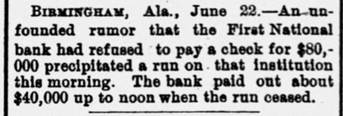 Unfounded rumor that the bank refused to pay an $80,000 check and gossip tied to Tennessee Coal, Iron & Railroad payroll troubles, causing small depositors to withdraw funds.