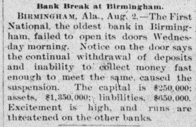 FAILED TO OPEN. Suspension of the First National Bank of Birmingham. BIRMINGHAM, Ala., Aug. 2.-The First National Bank failed to open its doors this morning. A notice was posted on the outside saying: "Continual withdrawals of deposits and inability to collect money fast enough to meet the same caused the suspension." The capital is $250,000; assets, $1,350,000; liabilities, $650,000. A run on other banks is threatened.