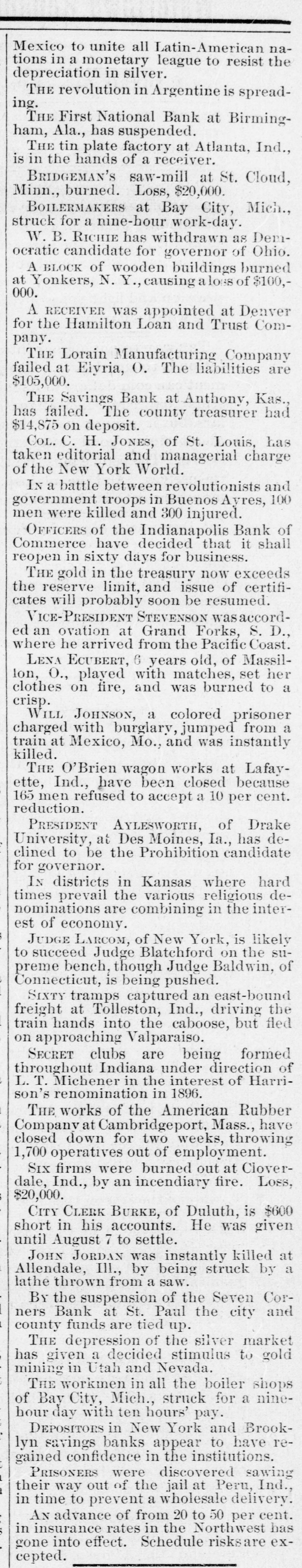 Mexico to unite all Latin-American nations in a monetary league to resist the depreciation in silver. THE revolution in Argentine is spreading. THE First National Bank at Birmingham, Ala., has suspended. THE tin plate factory at Atlanta, Ind., is in the hands of a receiver. BRIDGEMAN'S saw-mill at St. Cloud, Minn., burned. Loss, $20,000. BOILERMAKERS at Bay City, Mich., struck for a nine-hour work-day. W. B. RICHIE has withdrawn as Democratic candidate for governor of Ohio. A BLOCK of wooden buildings burned at Yonkers, N. Y., causing a loss of $100,000. A RECEIVER was appointed at Denver for the Hamilton Loan and Trust Company. THE Lorain Manufacturing Company failed at Elyria, O. The liabilities are $105,000. THE Savings Bank at Anthony, Kas., has failed. The county treasurer had $14,875 on deposit. CoL. C. H. JONES, of St. Louis, has taken editorial and managerial charge of the New York World. IN a battle between revolutionists and government troops in Buenos Ayres, 100 men were killed and 300 injured. OFFICERS of the Indianapolis Bank of Commerce have decided that it shall reopen in sixty days for business. THE gold in the treasury now exceeds the reserve limit, and issue of certificates will probably soon be resumed. VICE-PRESIDENT STEVENSON wasaccorded an ovation at Grand Forks, S. D., where he arrived from the Pacific Coast. LENA ECUBERT, 6 years old, of Massillon, 0., played with matches, set her clothes on fire, and was burned to a crisp. WILL JOHNSON, a colored prisoner charged with burglary, jumped from a train at Mexico, Mo., and was instantly killed. THE O'Brien wagon works at Lafayette, Ind., have been closed because 165 men refused to accept a 10 per cent. reduction. PRESIDENT AYLESWORTH, of Drake University, at Des Moines, Ia., has declined to be the Prohibition candidate for governor. IN districts in Kansas where hard times prevail the various religious denominations are combining in the interest of economy. JUDGE LARCOM, of New York, is likely to succeed Judge Blatchford on the supreme bench, though Judge Baldwin, of Connecticut, is being pushed. SIXTY tramps captured an east-bound freight at Tolleston, Ind., driving the train hands into the caboose, but fled on approaching Valparaiso. SECRET clubs are being formed throughout Indiana under direction of L. T. Michener in the interest of Harrison's renomination in 1896. THE works of the American Rubber Company at Cambridgeport, Mass., have closed down for two weeks, throwing 1,700 operatives out of employment.