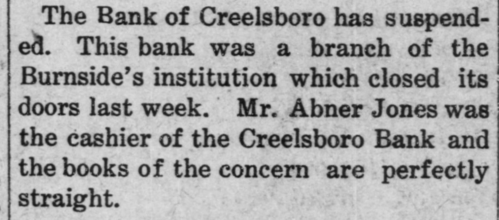 The Bank of Creelsboro has suspended. This bank was a branch of the Burnside's institution which closed its doors last week. Mr. Abner Jones was the cashier of the Creelsboro Bank and the books of the concern are perfectly straight.