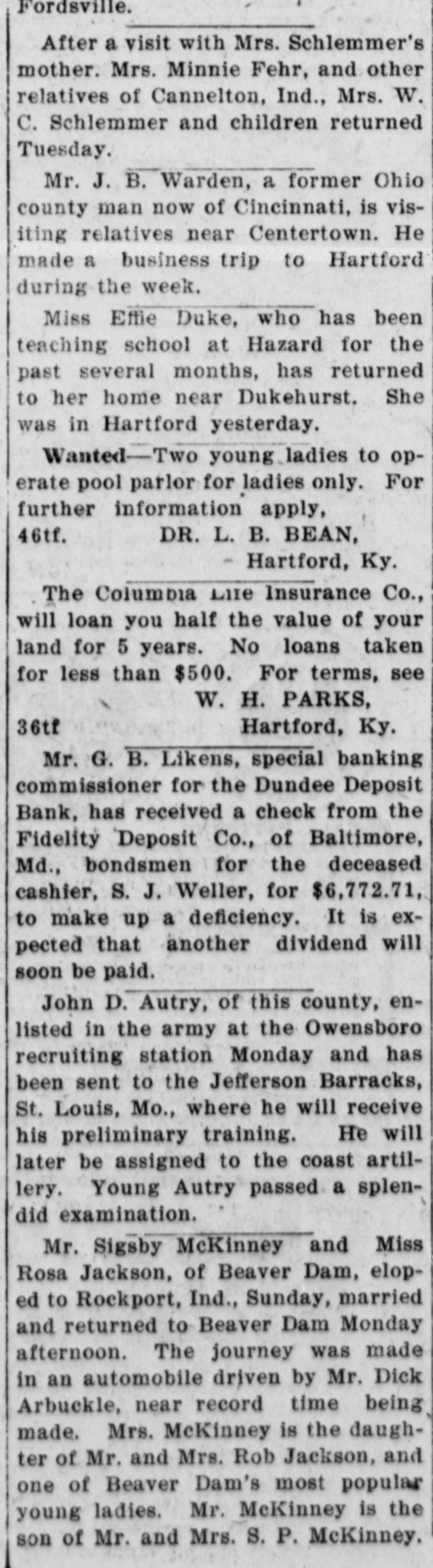 HANGING AS METHOD ffairs Placed In Hands Of Special Deputy-Depositors Are Safe. REAL REASON ASSIGNED One of the most tragic and deorable events that ever occurred Ohio county was the suicide last some time between 9:30 a. and noon, of Mr. S. J. Weller, at village of Dundee, this county. Weller was Cashier of the DunDeposit Bank, a position he had since its organization about 10 ago. He was also well-to-do herwise, owning a fine large farm beautiful residence property. He popular with everybody and one the county's foremost citizens. J. E. Mitchell was assistant shier of the bank. Mr. Weller was at the bank as Friday morning, and just as siness hours began, Mr. E. L. Aua State bank examiner, starthis work on the books and affairs the bank. Within a few minutes Weller excused himself on some plea, leaving Mr. Augustus Mr. Mitchell in the bank. The continued absence of Mr. eller was not particularly noticed after the noon hour, when intiries were made. Failing to lohim, his friends and family bea search, not apprehending anyvery serious. As the hours by the search became more ligent and finally about 4 o'clock the afternoon his body was found anging in the meat house just in rear of his residence. He had up a piece of rope that had lying around the house for time and used it with deadly fect. Evidently standing on a salt he had adjusted one end of rope to a joist overhead, knotted other end around his neck and imped off. His feet cleared the round only by a few inches. When his body was cold and nearly and he had evidently been dead hours. The news of Mr. Weller's suicide eated much interest asd sorrow, he was well known and about last man anybody would susof doing such a thing. He was unusually sunny disposition. Folthe discovery of Mr. Weller's Mr. Augustus, the examiner, legraphed for Mr. R., P. Revel, State Banking Commissionof Frankfort, who arrived on the next morning. A cursory examination of the affairs showed no evidence of shortage. Soon after, however, lowing a conference of five the directors of the bank, it was to place the affairs of the in liquidation. The directors the bank are: Porter McDowell, esident; Schuyler Acton, J. D. Martin Neighbors, F. N. LanEllis Mitchell and S. J. WelAfter the death of Mr. Welwho was virtually in charge of bank, it was feared by the directhere would be a run on the They, therefore, thought it for the State department to complete charge of affairs. Until a complete audit is made of books of the bank, any staterelative to the exact financial nding of the institution would be
