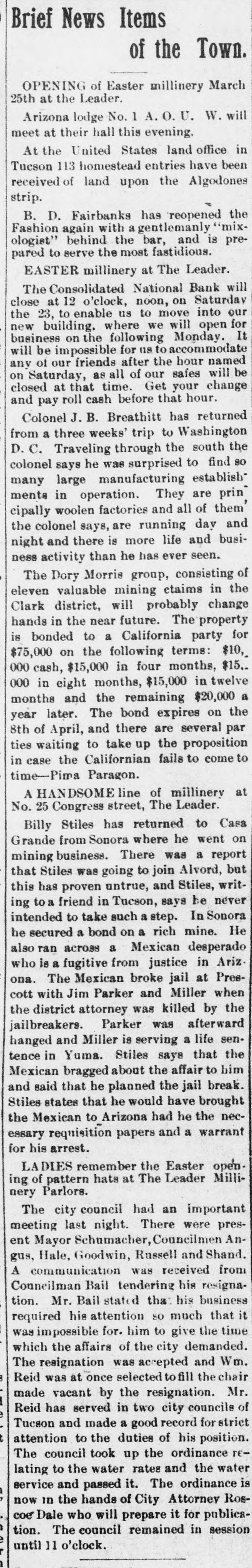 Brief News Items of the Town. OPENING of Easter millinery March 25th at the Leader. Arizona lodge No. 1 A. O. U. W. will meet at their hall this evening. At the United States land office in Tucson 113 homestead entries have been received of land upon the Algodones strip. B. D. Fairbanks has `reopened the Fashion again with a gentlemanly "mixologist" behind the bar, and is prepared to serve the most fastidious. EASTER millinery at The Leader. The Consolidated National Bank will close 12 noon, on the to enable us to move our 23, at o'clock, will Saturdav into where we open for on the will for us to new business be building. impossible following accommodate Monday. hour named It friends after the on as all of our be that time. Get your any closed Saturday, of our at safes change will and pay roll cash before that hour. Colonel J.B. Breathitt has returned from a three weeks' trip to Washington D.C. Traveling through the south the colonel says he was surprised to find so many large manufacturing establish ments in They are operation. all of them' prin cipally woolen factories and the colonel says, are running day and night and there is more life and business activity than he has ever seen. The Dory Morris group, consisting of eleven valuable mining etaims in the Clark district, will probably change hands in the near future. The property is bonded to a California party for $75,000 on the following terms: $10, 000 cash, $15,000 in four months, $15.. 000 in eight months, $15,000 in twelve months and the remaining $20,000 a later. The bond expires on the 8th of and there are par year April, several ties waiting to take up the proposition in case the Californian fails to come to time-Pima Paragon. A HANDSOME line of millinery at No. 25 Congress street, The Leader. Billy Stiles has returned to Casa Grande from Sonora where he went on mining business. There was a report that Stiles was going to join Alvord, but this has proven untrue, and Stiles, writing to a friend in Tucson, says be never intended to take such a step. In Sonora he secured a bond on a rich mine. He also ran across a Mexican desperado who is a from Mexican ona. The fugitive broke justice jail at in Pres- Arizcott with Jim Parker and Miller when the district attorney was killed by the Parker was and Miller is a senjailbreakers. hanged serving afterward life Yuma. says the Mexican about him tence in bragged Stiles the affair that to and said that he planned the jail break. Stiles states that he would have brought to Arizona had he the necpapers a essary the Mexican requisition and warrant for his arrest. LADIES remember the Easter opening of pattern hats at The Leader Millinery Parlors. The city council had an important meeting last night. There were present Mayor Schumacher, Councilment Angus, Hale, Goodwin, Russell and Shand. A communication was received from Councilman Bail tendering his resignation. Mr. Bail stated tha: his business required his attention so much that it was impossible for. him to give the time which the affairs of the city demanded. The resignation was accepted and Wm. Reid was at once selected to fill the chair made vacant by the resignation. Mr. Reid has served in two city councils of Tucson and made a good record for strict t attention to the duties of his position. The council took up the ordinance relating to the water rates and the water service and passed it. The ordinance is now in the hands of City Attorney Roscoe Dale who will prepare it for publication. The council remained in session until 11 o'clock.