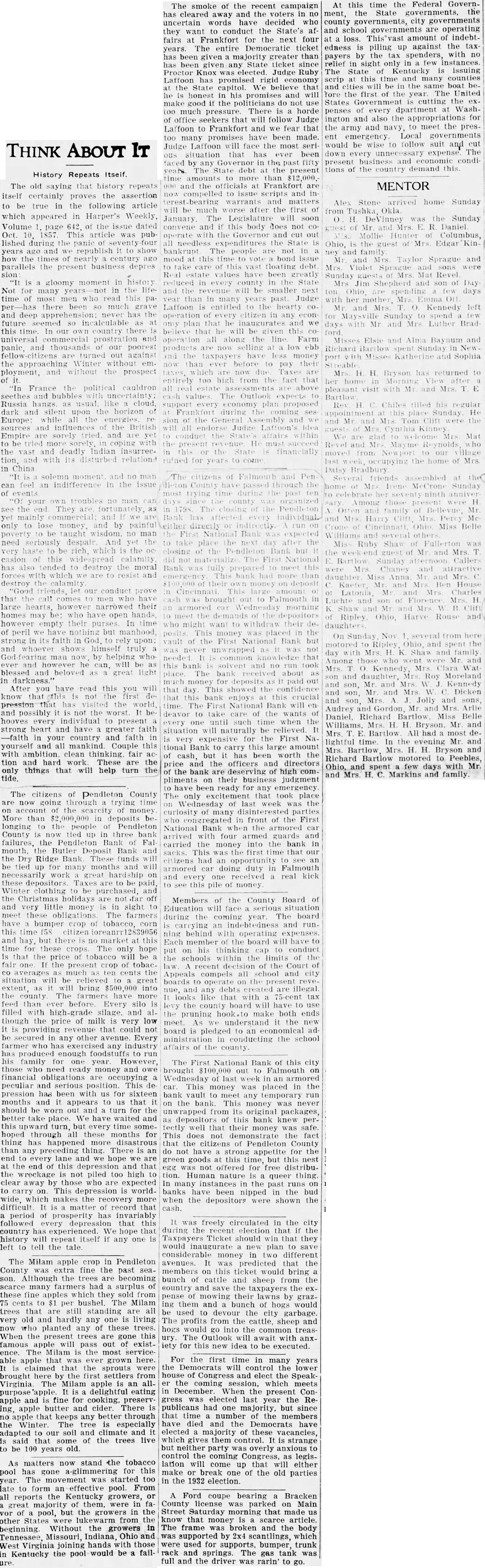 THINK ABOUT IT The old saying that history repeats itself certainly proves the assertion be true in the following article which appeared in Harper's Weekly, Volume page 642. of the issue dated Oct. published during the panic years and republish show how the ago parallels the present business depres is gloomy moment in history Not many years in the lifetime most read pathere been so deep the this our country and panic, and thousands our poorest turned out against the approaching Winter and without the prospect of France political cauldron and bubbles Russia hangs dark silent upon the horizon of Europe: while sources and influences the British Empire are and coping the vast deadly with its disturbed relations China solemn moment no feel an indifference in the issue of events no the end They fortunately yet commercial only to lose money. and by taught wisdom. no man need seriously And yet the very haste to rich, which the casion this calamity has also tended to destroy the moral forces with which are to resist and destroy calamity friends, our conduct prove call to large their homes may open hands, however empty their In time of peril have but strong upon: and God now, by helping who he can, will blessed and beloved great light in After you have read this you will know that first that has visited the world, possibly not the worst. behooves every individual to present strong heart and have -faith in your country and faith yourself mankind Couple this ambition. clean thinking fair tion These are the only things that help turn tide. The citizens of Pendleton County going account the More $2,000,000 in deposits longing to people County up in three bank failures, the Pendleton Bank Fal mouth, the Butler Deposit Bank and the Dry Ridge Bank These funds will tied for many will necessarily great hardship on depositors clothing and the off and very little money sight to meet obligations The farmers crop this time 158 hay, but market this these The hope that the price will be one the cΓop of tobac. much ten cents the situation will be relieved to great extent, as will bring $500,000 into county The farmers have more feed than before Every silo filled and though price of milk is very low providing could not secured any other Every has any industry produced enough run his family for year. those need ready financial obligations are occupying peculiar and serious position. This pression has been with us for sixteen months appears to us that should be worn turn for the better take place. We have waited and upward turn, but every time somehoped through these months for thing happened more disastrous than any preceding thing. There is end lane we hope are end this and that the not piled too high clear by those who expected to This is world. wide, which makes the more difficult period prosperity has invariably depression this country We hope that history will repeat itself if any one left to tell the tale The Milam apple crop in Pendleton County fine the past the trees are becoming had surplus of these fine they from cents to bushel The Milam trees that are are all very old and hardly any living who planted any of these trees. When the this famous will pass out of existThe Milam the most serviceable apple grown here. claimed that the sprouts were brought by settlers from Virginia Milam apple an alldelightful eating apple fine for cooking, preserving. apple butter and cider. There is apple keeps any through tree is adapted our and and is some of the live to be 100 old. As matters now stand the tobacco pool has this year. The started too late to form an effective pool. From all the Kentucky growers, or great majority them, were in favor pool, but the growers in the other States were from the beginning. Without growers in Tennessee, Missouri, Indiana, Ohio West Virginia joining hands those Kentucky the pool would be fail- The smoke of the recent campaign has away and the voters in uncertain words have decided who conduct the State's af fairs Frankfort the next four years Democratic ticket has been given greater than has given any State ticket since Proctor Judge Ruby Laffoon promised rigid economy the State capitol. We believe that he honest and will make good the politicians do not much pressure. There horde of office seekers that will follow Judge Laffoon to Frankfort and we fear that too many promises have been made. Judge Laffoon will face the most serious situation that has ever been Governor in the past fifty The debt the present time amounts than $12,000.and the Frankfort are and in will be worse after the first January Legislature and this body does not the cut out all needless the State bankrupt not mood this time bond issue this vast floating values have been greatly county in State and smaller next many years Judge Laffoon entitled the hearty operation citizen that inaugurates and will along line Farm low ebb and pay their entirely too high from the fact above values Outlook Frankfort during all endorse Judge Laffoon's for The citizens directly Bank the closing National Bank had Cincinnati to Falmouth morning This money vault National Bank but that this bank no about out that day This showed the confidence bank enjoys crucial time. The First National Bank will deavor to take care the wants one until such when the every situation naturally be relieved expensive the First National Bank to carry this large amount cash, but has worth the price and the officers directors bank deserving high compliments their business judgment have ready any took place the of in front the First National Bank armored arrived four armed guards and carried the money into the bank in sacks. This that our had an opportunity armored car doing duty in Falmouth and received real kick this pile of money Members of the County Board of Education during the coming The board year an and running behind Each member the board will have his thinking conduct the schools within of Court of Appeals compels all school and city boards the and d