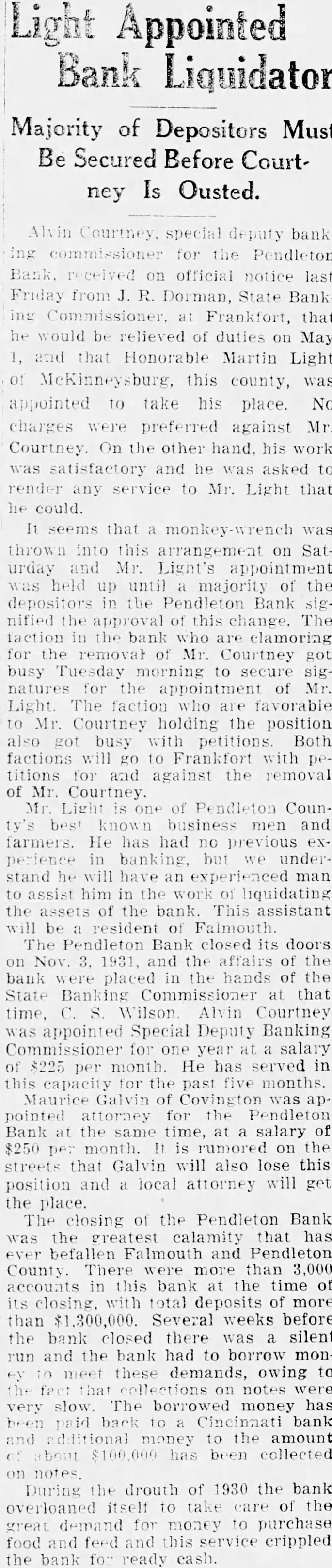 MONEY TAKEN BACK CINCY George W. Berger, President of the First National Bank, and a number of armed guards in two cars conveyed $100,000 to a Cincinnati bank on last Friday afternoon. The money was safely delivered to the depository of one of the largest banks in that city. This large sum of money was conveyed to Falmouth in an armored car on Wednesday of last week to meet any run on the bank following the closing of the Pendleton Bank. While this money was in Falmouth it was guarded during the night by special local guards. It was possibly the largest sum of money that ever slept in Falmouth over two nights. It developed that there was no need for this money to be brought to the First National, as there was no run made on the bank. This shows that the people of Falmouth and Pendleton county are very conservative in matters of this kind. It was well known that the First National Bank caried $186.000 in cash money of its own to meet any emergency or legitimate demand for money. There was as much money deposited in the First National Bank on Wednesday as was withdrawn.-Falmouth Outlook.