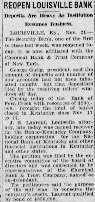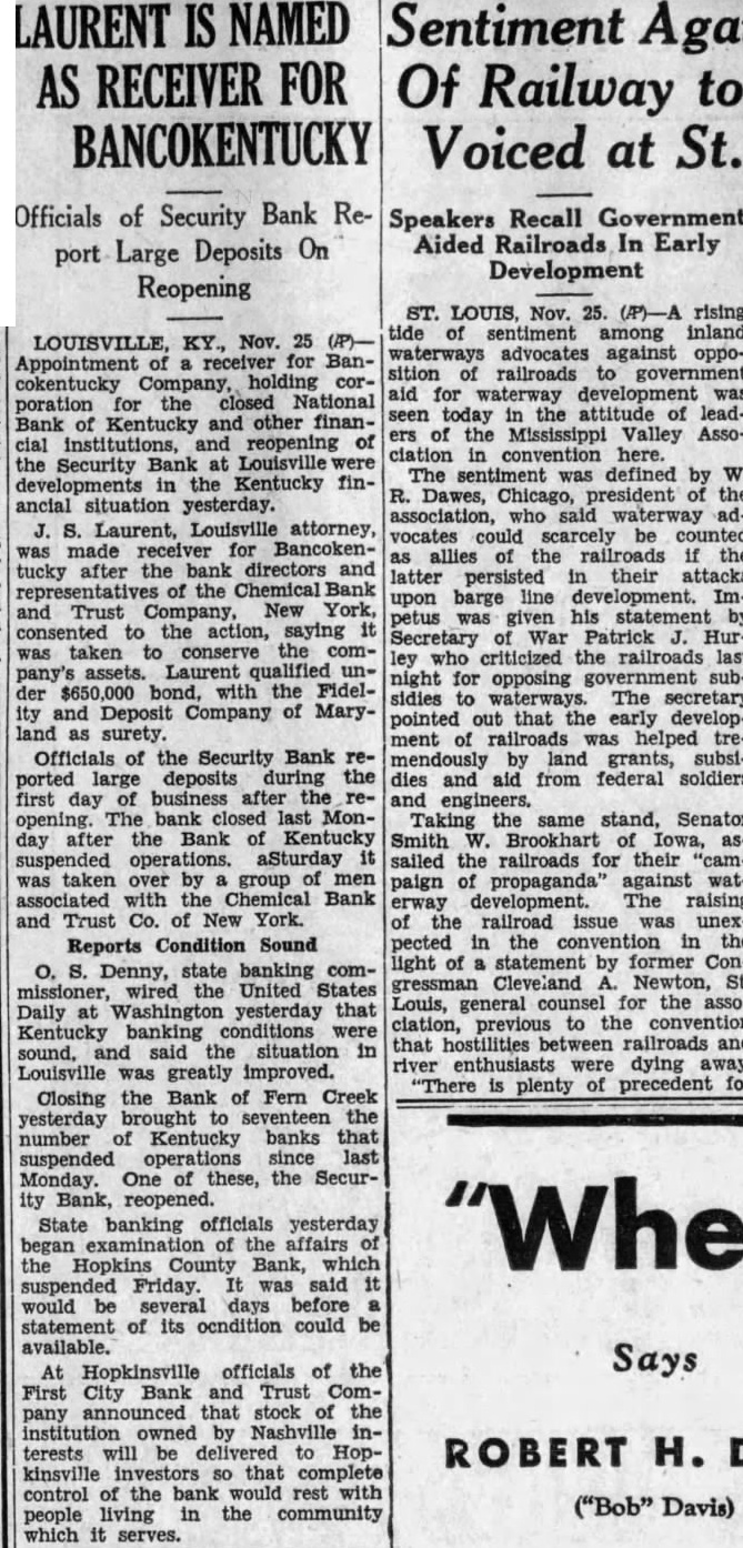 LAURENT IS NAMED AS RECEIVER FOR BANCOKENTUCKY Officials of Security Bank Report Large Deposits On Reopening tide of sentiment among inland LOUISVILLE, KY., Nov. 25 (P)waterways advocates against oppoAppointment of a receiver for Bansition of railroads to government cokentucky Company, holding coraid for waterway development was poration for the closed National seen today in the attitude of leadBank of Kentucky and other finaners of the Mississippi Valley Associal institutions, and reopening of ciation in convention here. the Security Bank at Louisville were The sentiment was defined by W developments in the Kentucky finR. Dawes, Chicago, president of the ancial situation yesterday. association, who said waterway adJ. S. Laurent, Louisville attorney, vocates could scarcely be counted was made receiver for Bancokenas allies of the railroads if the tucky after the bank directors and latter persisted in their attacks representatives of the Chemical Bank upon barge line development Imand Trust Company, New York, petus was given his statement by consented to the action, saying it Secretary of War Patrick J. Hurwas taken to conserve the comley who criticized the railroads last pany's assets. Laurent qualified unnight for opposing government subder $650,000 bond, with the Fidelsidies to waterways The secretary ity and Deposit Company of Marypointed out that the early developland as ment of railroads was helped treOfficials of the Security Bank re- mendously by land grants, subsiported large deposits during the dies and aid from federal soldiers first day of business after the re- and engineers. opening. The bank closed last Mon- Taking the same stand, Senator day after the Bank of Kentucky Smith W. Brookhart of Iowa, assuspended operations. aSturday it sailed the railroads for their "camwas taken over by a group of men paign of propaganda' against watassociated with the Chemical Bank erway development. The raising and Trust Co. of New York. of the railroad issue was unexReports Condition Sound pected in the convention in the light of a statement by former ConO. S. Denny, state banking comgressman Cleveland A. Newton, St. missioner, wired the United States Louis, general counsel for the assoDaily at Washington yesterday that ciation, previous to the convention Kentucky banking conditions were that hostilities between railroads and sound, and said the situation in river enthusiasts were dying away Louisville was greatly improved. "There is plenty of precedent for Closing the Bank of Fern Creek yesterday brought to seventeen the number of Kentucky banks that suspended operations since last Monday. One of these, the Security Bank, reopened. State banking officials yesterday began examination of the affairs of the Hopkins County Bank, which suspended Friday. It was said it would be several days before a statement of its ocndition could be available. Says At Hopkinsville officials of the First City Bank and Trust Company announced that stock of the institution owned by Nashville interests will be delivered to Hopkinsville investors so that complete control of the bank would rest with ("Bob" Davis) people living in the community which it serves.