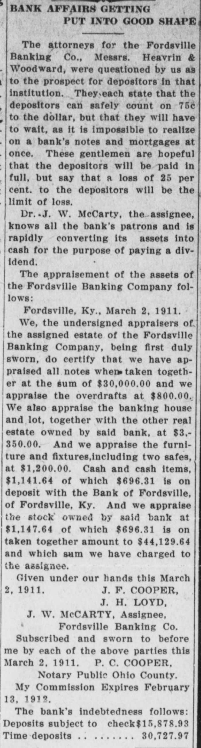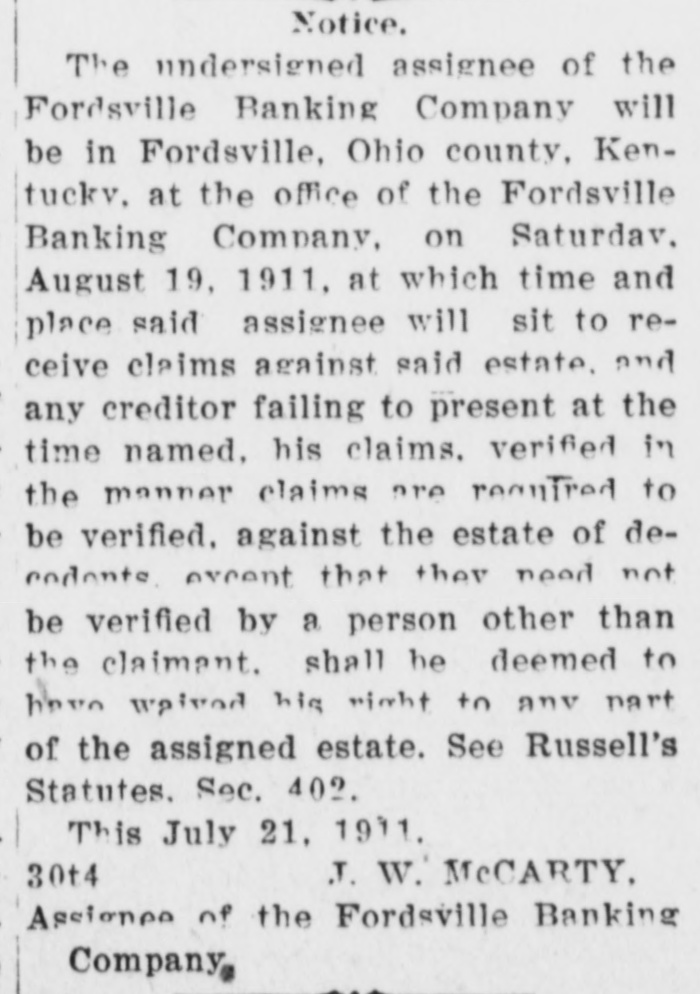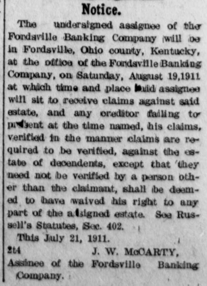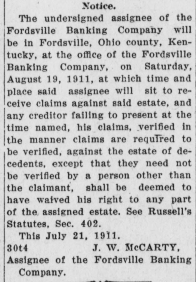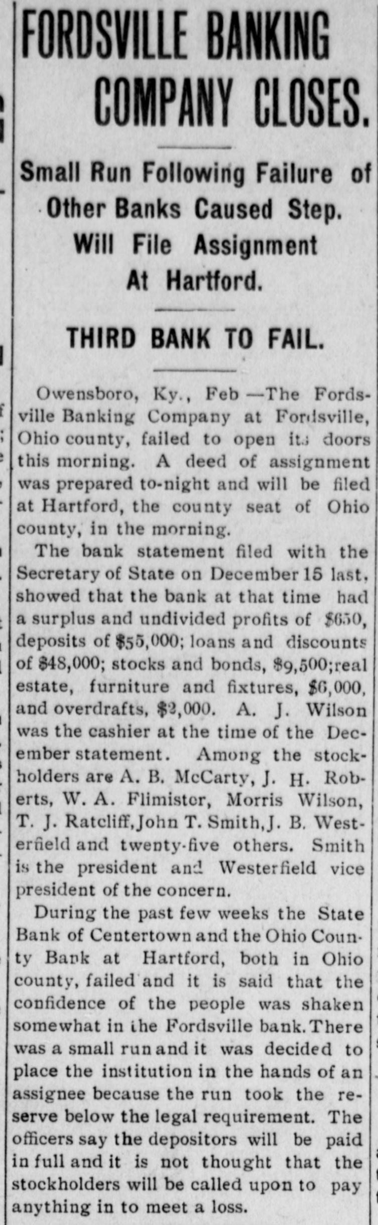 FORDSVILLE BANKING COMPANY CLOSES. Small Run Following Failure of Other Banks Caused Step. Will File Assignment At Hartford. THIRD BANK TO FAIL. Owensboro, Ky., Feb - The Fordsville Banking Company at Fordsville, Ohio county, failed to open its doors this morning. A deed of assignment was prepared to-night and will be filed at Hartford, the county seat of Ohio county, in the morning. The bank statement filed with the Secretary of State on December 15 last, showed that the bank at that time had a surplus and undivided profits of $650, deposits of $55,000; loans and discounts of $48,000; stocks and bonds, $9,500;real estate, furniture and fixtures, $6,000, and overdrafts, $2,000. A. J. Wilson was the cashier at the time of the December statement. Among the stockholders are A. B. McCarty, J. H. Roberts, W. A. Flimister, Morris Wilson, T. J. Ratcliff, John T. Smith,J. B. Westerfield and twenty-five others. Smith is the president and Westerfield vice president of the concern. During the past few weeks the State Bank of Centertown and the Ohio County Bank at Hartford, both in Ohio county, failed and it is said that the confidence of the people was shaken somewhat in the Fordsville bank. There was a small run and it was decided to place the institution in the hands of an assignee because the run took the reserve below the legal requirement. The officers say the depositors will be paid in full and it is not thought that the stockholders will be called upon to pay anything in to meet a loss.