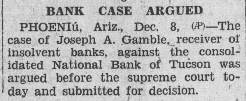 Article (Dec 8, 1927) reports a court case involving Joseph A. Gamble, receiver of insolvent banks, against the Consolidated National Bank of Tucson. No mention of a depositor run; a receiver is involved, indicating the bank was insolvent and in receivership/closed. Limited information — only the court argument is described.
