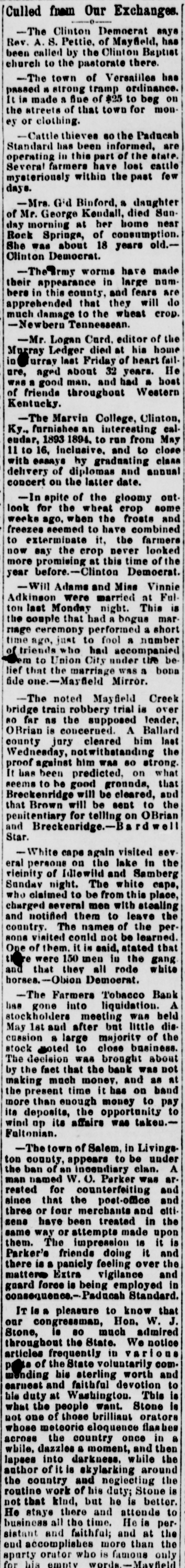 Culled from Our Exchanges. -The Clinton Democrat says Rev. A. S. Pettie, of Mayfield, has been called by the Clinton Baptist church to the pastorate there. -The town of Vereailles has passed H strong tramp ordinance. It is made a flue of $25 to beg on the streets of that town for money or clothing. -Cattle thieves the Paducab Standard has been informed, are operating in this part of the state. Several farmers have lost cattle mysteriously within the past few days. -Mrs. G'd Binford, a daughter of Mr. George Kendall, died Sunday morning at her home near Rock Springs, of consumption. She was about 18 years old.Olinton Democrat. -The grmy worms have made their appearance in large numhere in this county, and fears are apprehended that they will do much damage to the wheat crop. -Newbern Tennessean. -Mr. Logan Card. editor of the Murray Ledger died at his home in urray last Friday of heart failare, aged about 32 years. He WHS a good man. and had a host of friends throughout Western Kentucky. -The Marvin College, Clinton, Ky., furnishes an interesting calendar, 1893 1894. to run from May 11 to 16, inclusive. and to close with essays by graduating class delivery of diplomas and annual concert on the latter date. -In spite of the gloomy out. look for the wheat erop some weeks ago, when the frosts and freezes seemed to have combined to exterminate it, the farmers now say the erop never looked more promising at this time of the year before.-Clinton Democrat. -Will Adams and Miss Vinnie Adkinson were married at Ful. ton last Monday night. This is the couple that had a bogus marriage ceremony performed a short time ago, just to fool a number of triends who had accompanied -Sem to Union City under Life belief that the marriage was a bona fide one.-Mayfield Mirror. -The noted Mayfield Creek bridge train robbery trial is over 80 far as the supposed leader. OBrian is concerned. A Ballard county jury cleared him last Wednesday, notwithstanding the proof against him was so strong. It has been predicted, on what seems to he good grounds, that Breckenridge will be cleared, and that Brown will be sent to the penitentiary for telling on OBrian and Breckenridge.-Ba Star. -White cape again visited sev. eral persons on the lake in the vieinity of Idlewild and Samberg Sundav night. The white caps, who claimed to be from this place, charged several men with stealing and notified them to leave the country. The names of the persons visited could not be learned. One of them. it is said, stated that were 150 men in the gang and that they all rode white horses.-Obion Democrat. -The Farmers Tobacco Bank has gone into liquidation. A stockholders meeting was beld May 1st and after but little diecussion a large majority of the stock Noted to close business. The decision was brought about by the fact that the bank was not making much money, and as at the present time it has on band more than enough money to pay its deposits, the opportunity to wind up its affairs was taken.Fultonian. -Thetown of Salem, in Livingston county, appears to be under A the ban of an incendiary clan. man named W. O. Parker was ar. rested for counterfeiting and since that the post-office and three or four merchants and elti. zens have been treated in the same way or attempts made upon them. The impression is it is Parker's friends doing it and there is a panicly feeling over the matters Extra vigilance and guard force i being employed in consequence.-Paducah Standard. IT le a pleasure to know that our congressman, Hon. W. J. Stone, is 80 much admired throughout the State. We notice articles frequently in various of the State voluntarily com. mending bis sterling worth and earnest and faithful devotion to bis duty at Washington. This is what the people want. Stone is not one of those brilliant orators whose meteorio eloquence flashes across the country once in a while, dazzles a moment, and then lapses into darkness, while the author of it is skylarking around the country and neglecting the routine work of his duty; Stone is not that kind, but he is better. He staye there and attends to business all the time. He is persistant and faithful; and at the end accomplishes more than the sparty orator who is famous only for his empty words -Mavfield