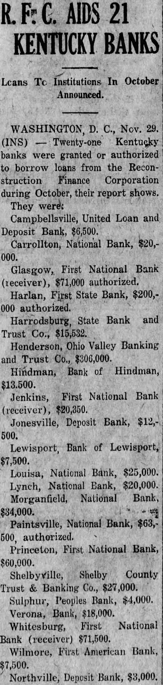 KENTUCKY BANKS Lcans Institutions In October Announced. WASHINGTON, D. C., Nov. 29. (INS) Twenty-one Kentucky banks were granted or authorized to borrow loans from the Reconstruction Finance Corporation during October, their report shows They were: Campbellsville, United Loan and Deposit Bank, $6,500. Carrollton, National Bank, $20, 000. Glasgow, First National Bank (receiver), $71,000 authorized. Harlan, First State Bank, $200,000 authorized. Harrodsburg, State Bank and Trust Co., $15,532. Henderson, Ohio Valley Banking and Trust Co., $306,000. Hindman, Bank of Hindman, $13.500. First National Bank Jenkins, (receiver), $20,350. Jonesville, Deposit Bank, $12, 500. Lewisport, Bank of Lewisport, $7,500. Louisa, National Bank, $25,000. Lynch, National Bank, $20,000. National Bank, Morganfield, $34,000. Paintsville, National Bank, $63,500. authorized. Princeton, First National Bank, $60,000. Shelby County Trust & Banking Co., Sulphur, Peoples Bank, $4,000. Verona, Bank, $18,000. Whitesburg, First National Bank (receiver) $71,500. Wilmore, First American Bank, $7,500. Northville, Deposit Bank, $3,000.